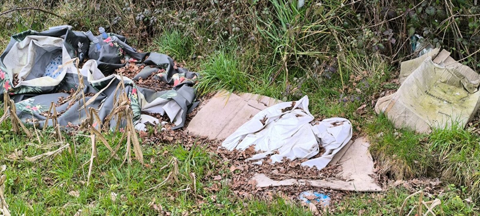 Dépôt de déchets dans un champ situé le long de la voie verte de Pouancé. Il s'agit de déchets ménagers divers dont un jacuzzi gonflable.