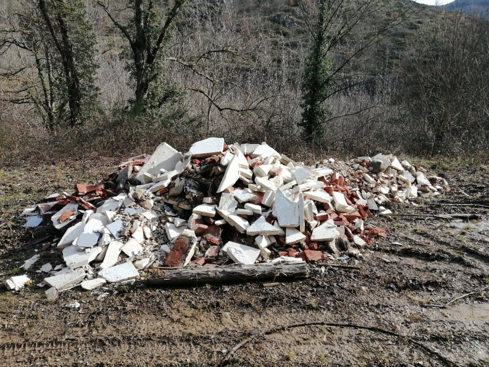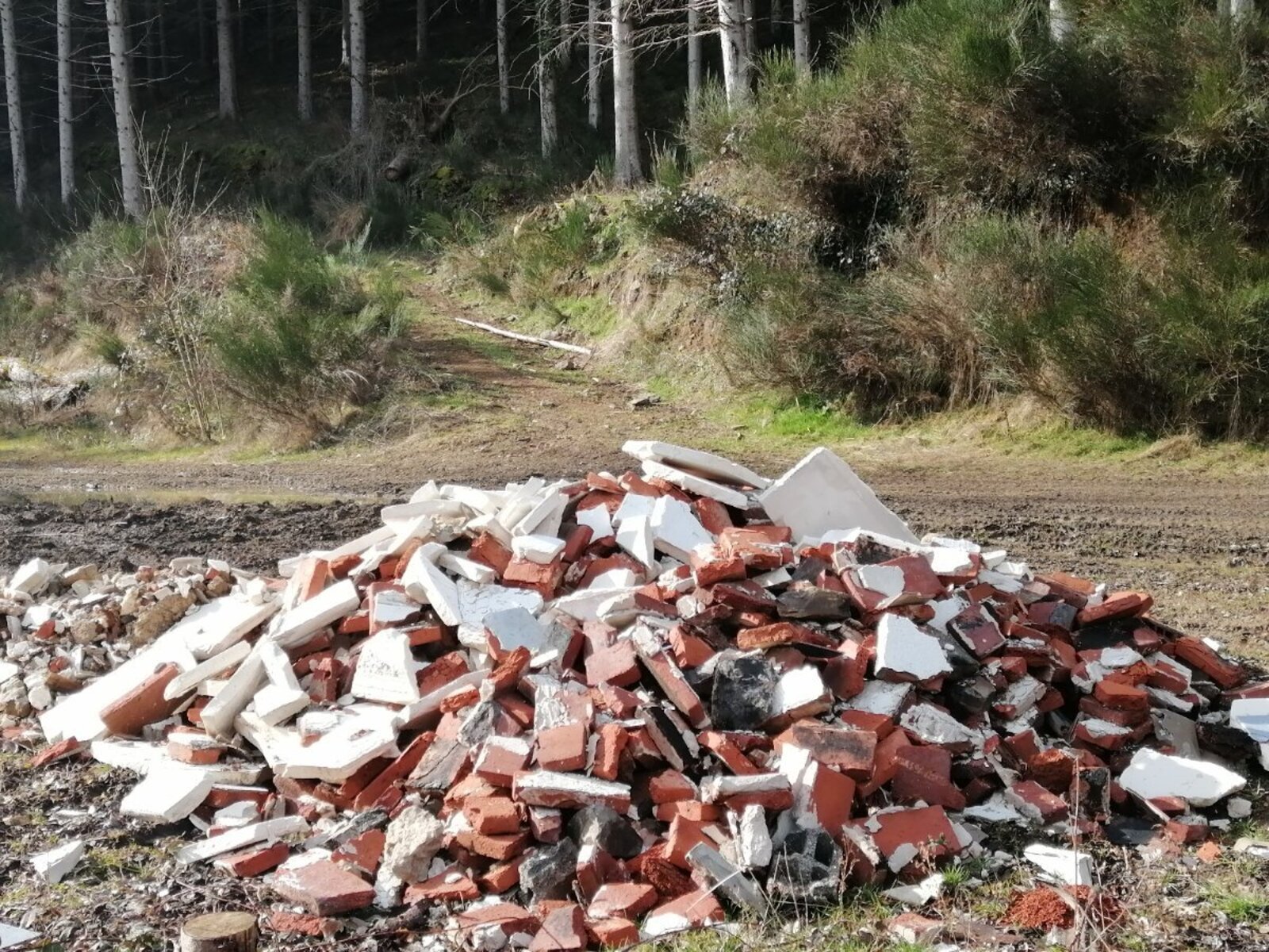 Divers résidus du chantier de la mairie de Chazelles : grande quantité de morceaux de cloisons plâtrées entre autres. L'entreprise ayant effectué ce dépôt (les ateliers de la Bruyère à Langeac) contactée pour explications, indique l'avoir fait sur demande de Mr. le Maire qui comptait utiliser ces gravats pour combler une piste forestière.