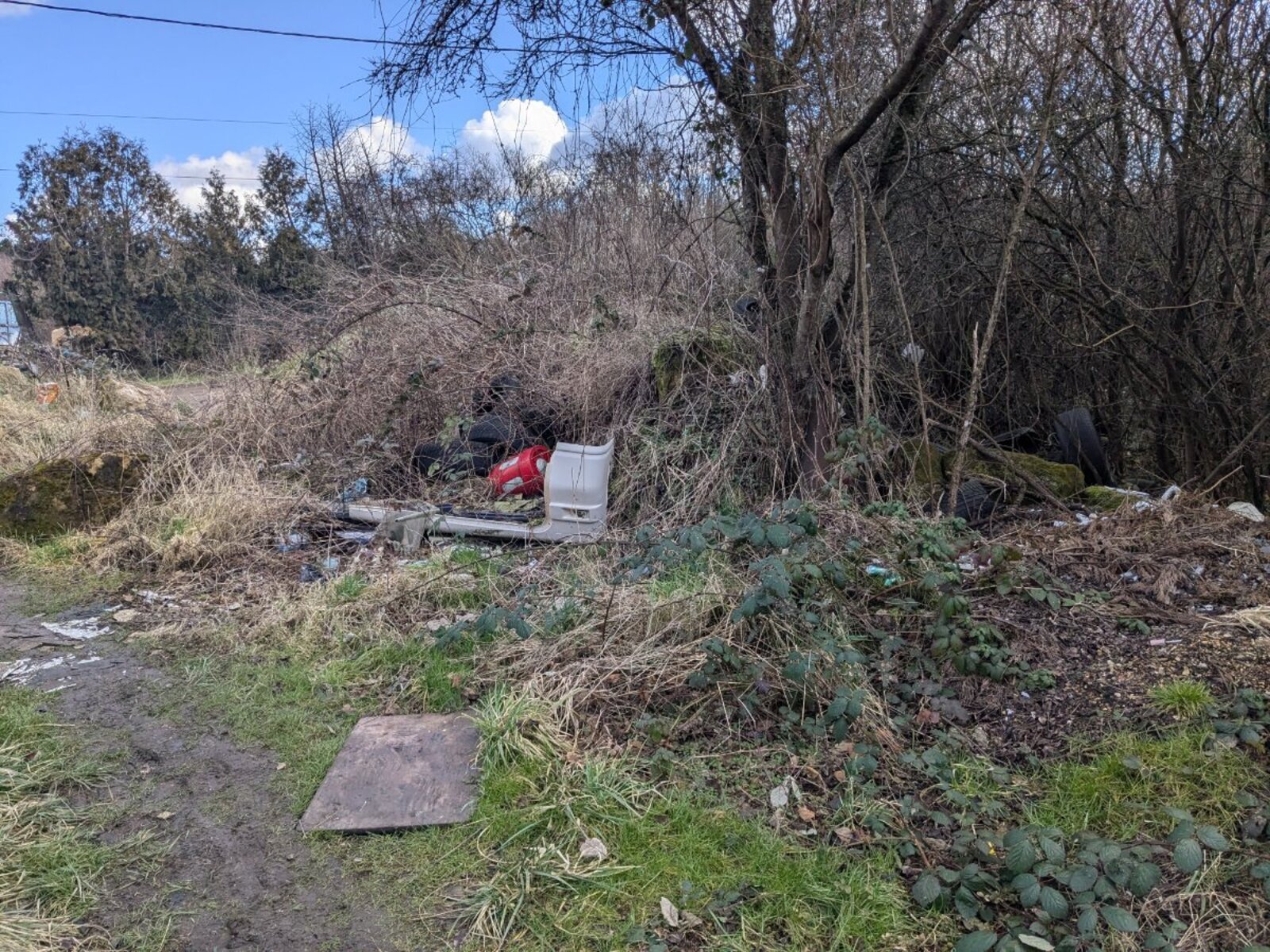 Dépôt sauvage de déchets (pneus, plastiques, bonbonne, pare-choc...) derrière le talus au bout du chemin de la petite Broche, en direction de la déchetterie du Pas du Loup.