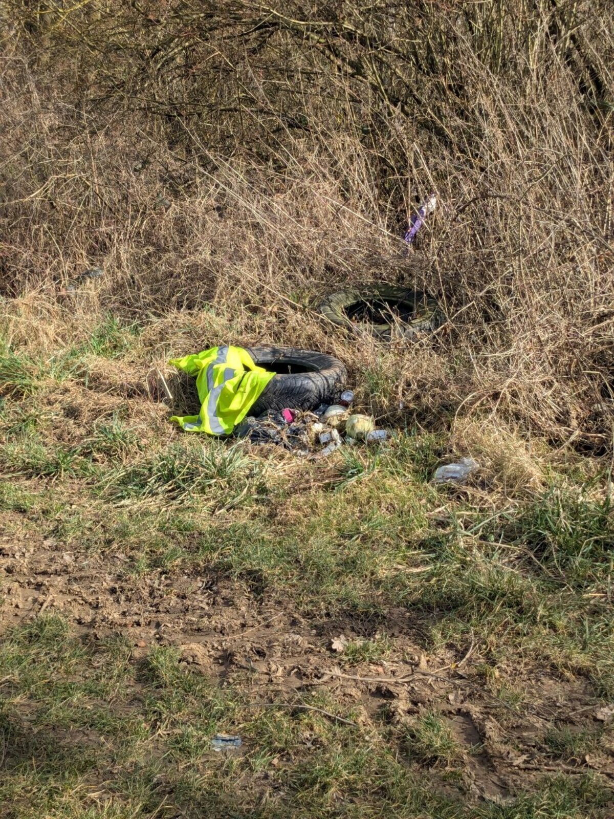 Dépôt sauvage de déchets (pneus, gilet jaune, divers plastiques...) au bord du Chemin Vert.