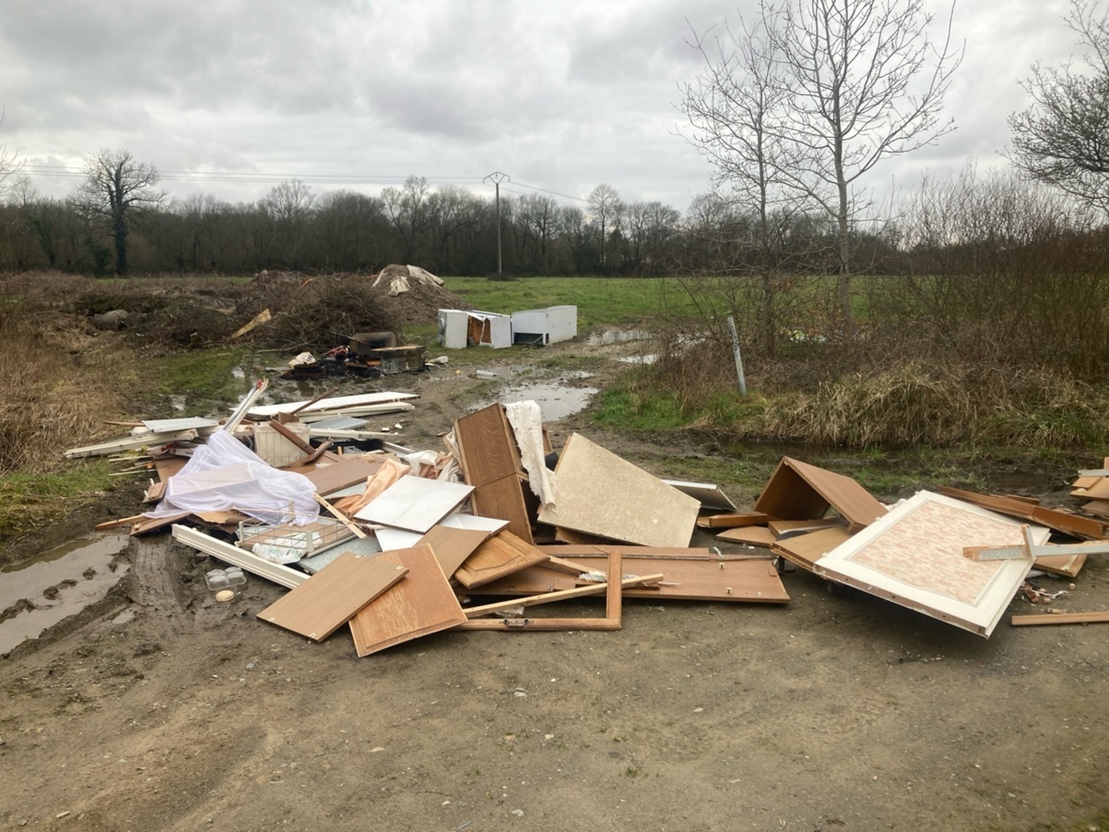 Dépôt de déchets sauvage tout le long du chemin. Bois, plastiques, huiles