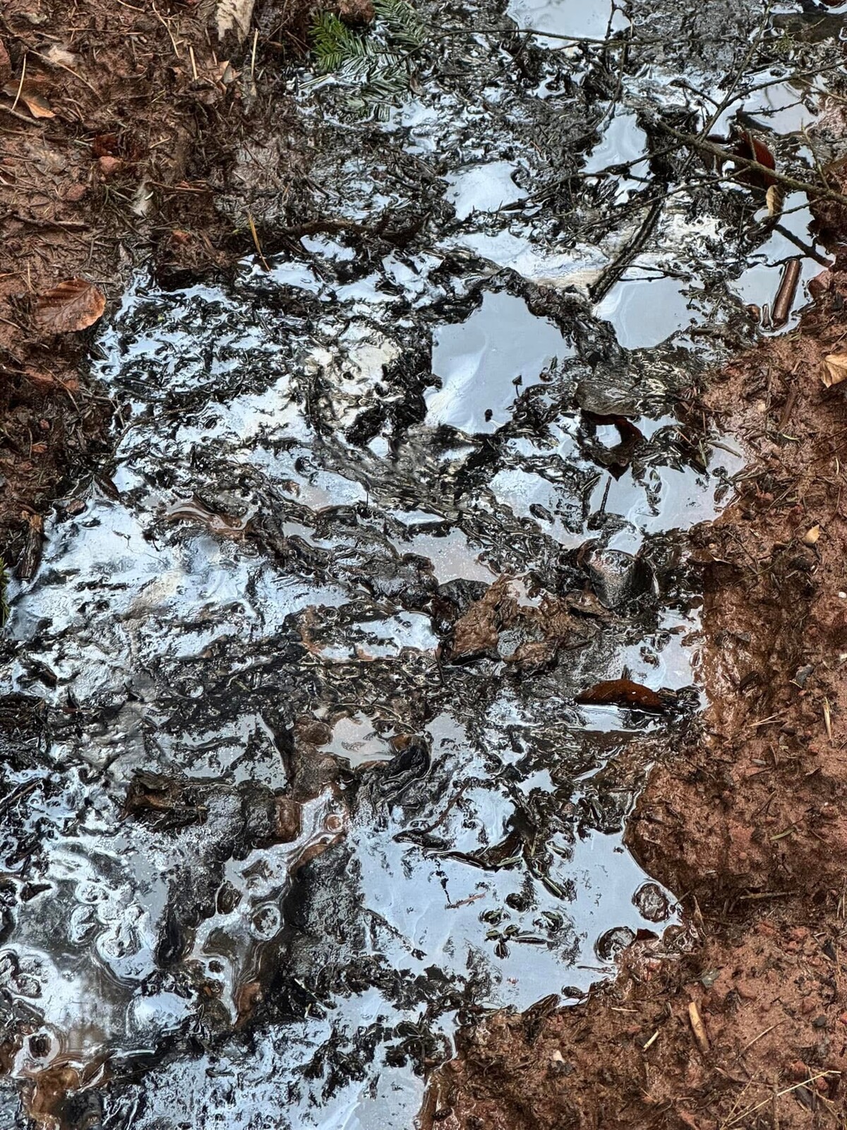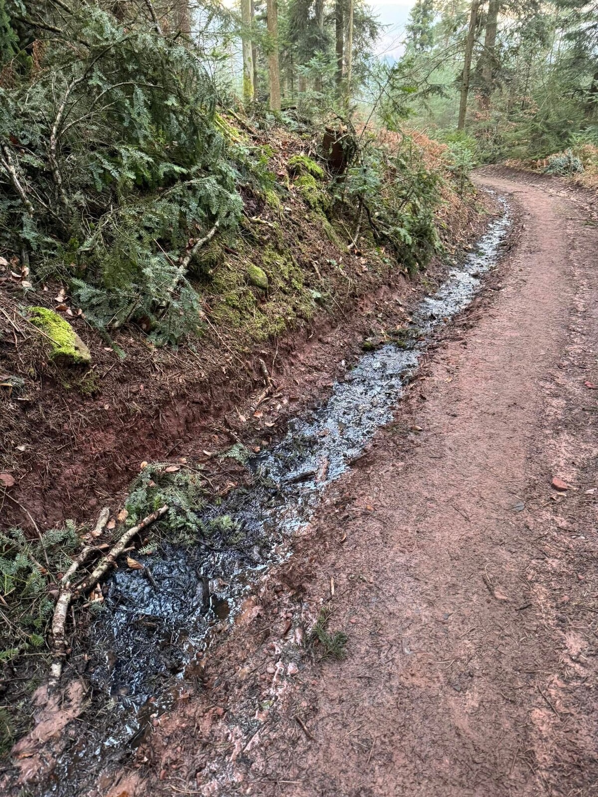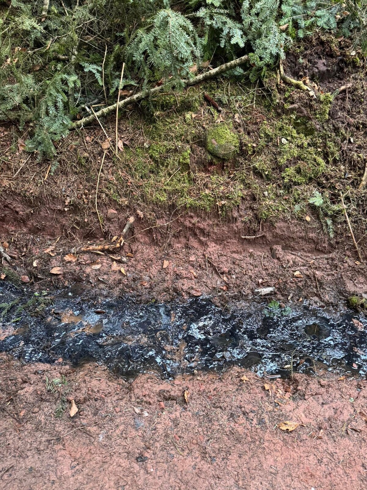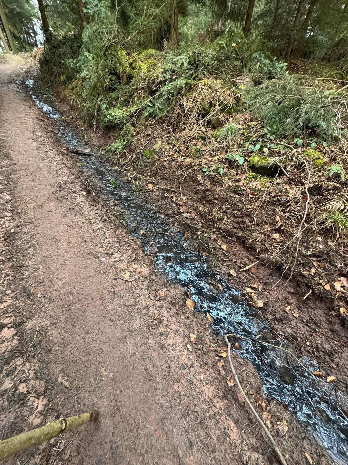 Ecoulement de produits polluants de type hydrocarbure probablement suite à des travaux forestiers
