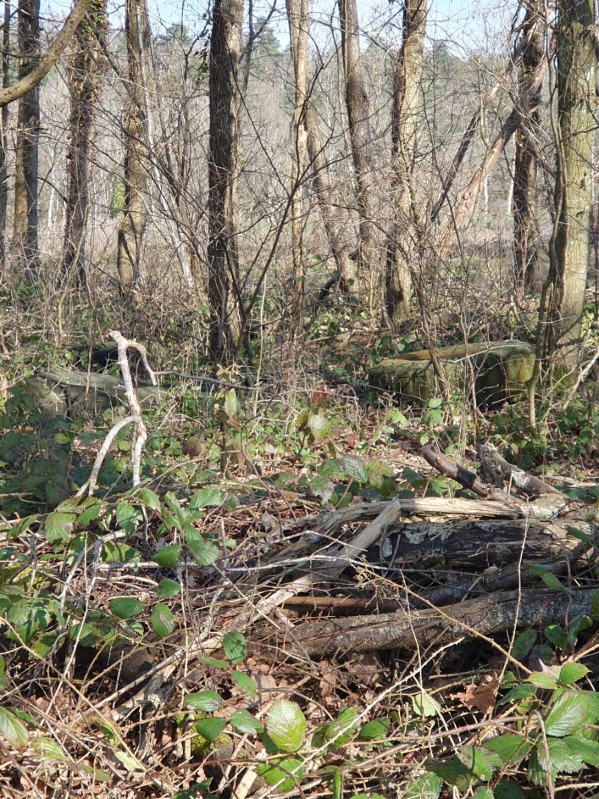 Pneus laissés à l'abandon dans une parcelle boisée, recouvert par la végétation.