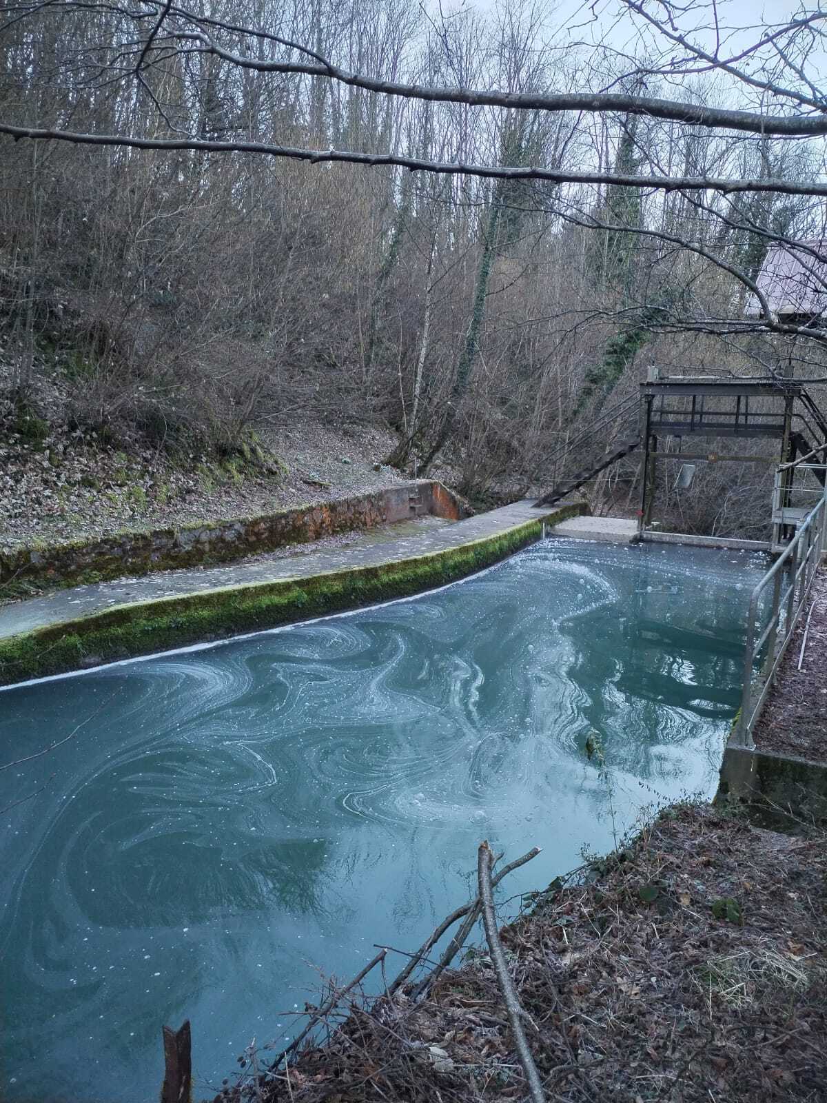 Très régulièrement (plusieurs fois par mois), la surface de l'eau du ruisseau de la Coche, au niveau du bassin du barrage, est recouverte d'une substance blanche.