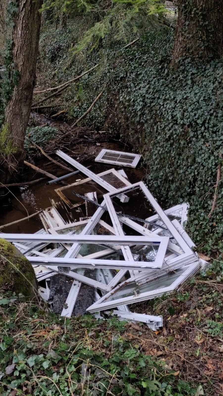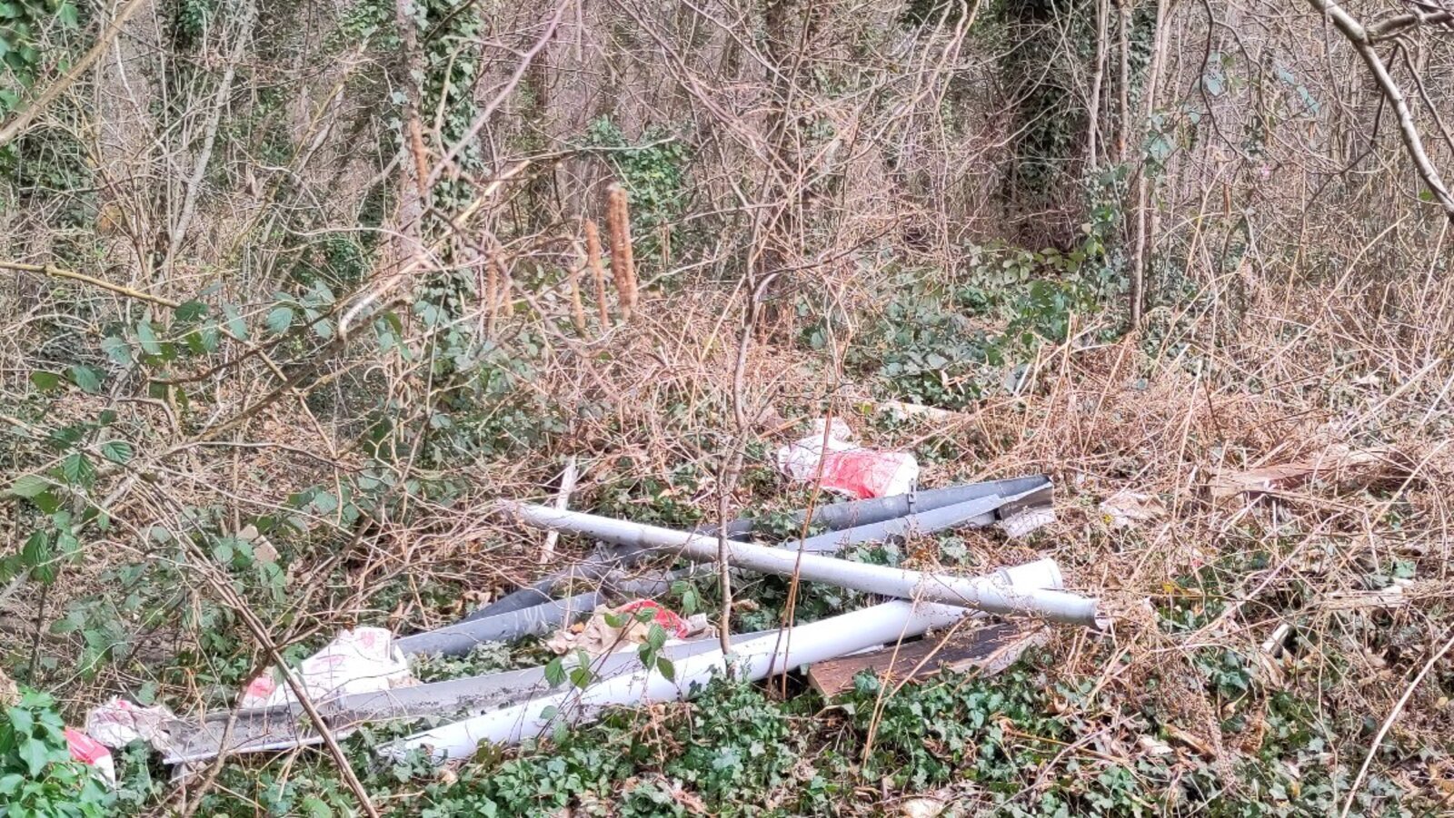 Dépôts récurrents de déchets de construction divers dont fenêtres, sacs de ciment, gouttières ... dans le chemin en bord de la départementale.