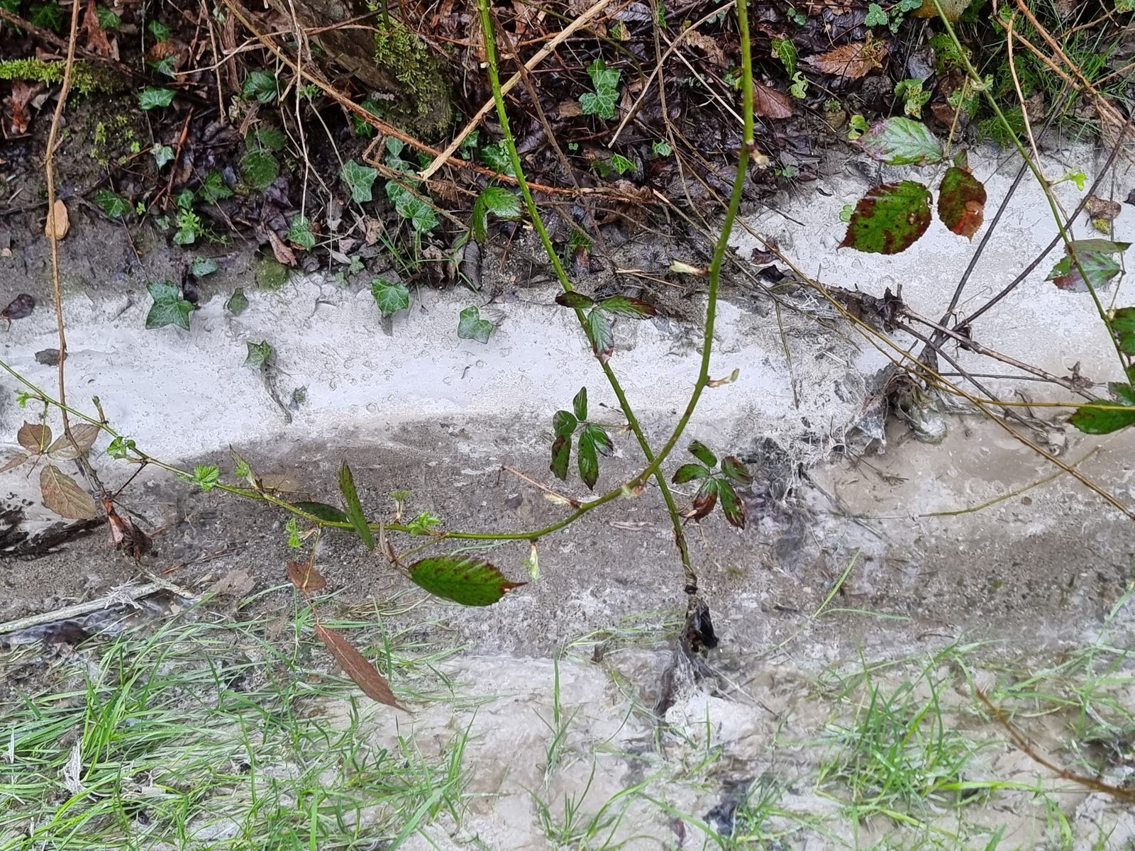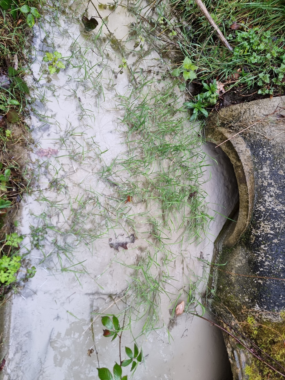 Constat du rejet d'une substance suspecte (couleur grise et consistance boueuse) depuis une buse située à l'arrière de l'usine exploitée par la société Team Plastique. La buse refoule directement dans un fossé. La substance est présente sur plusieurs dizaines de mètres.