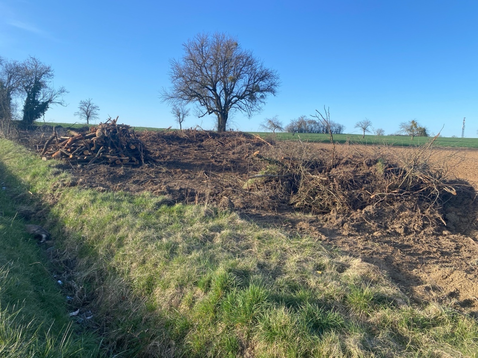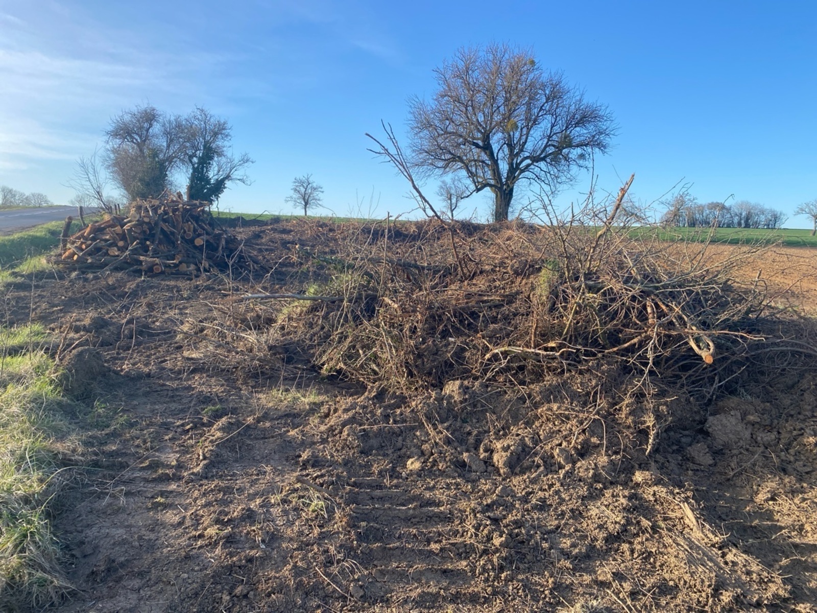 Tout un bosquet a été rasé et déraciné le long de la route.