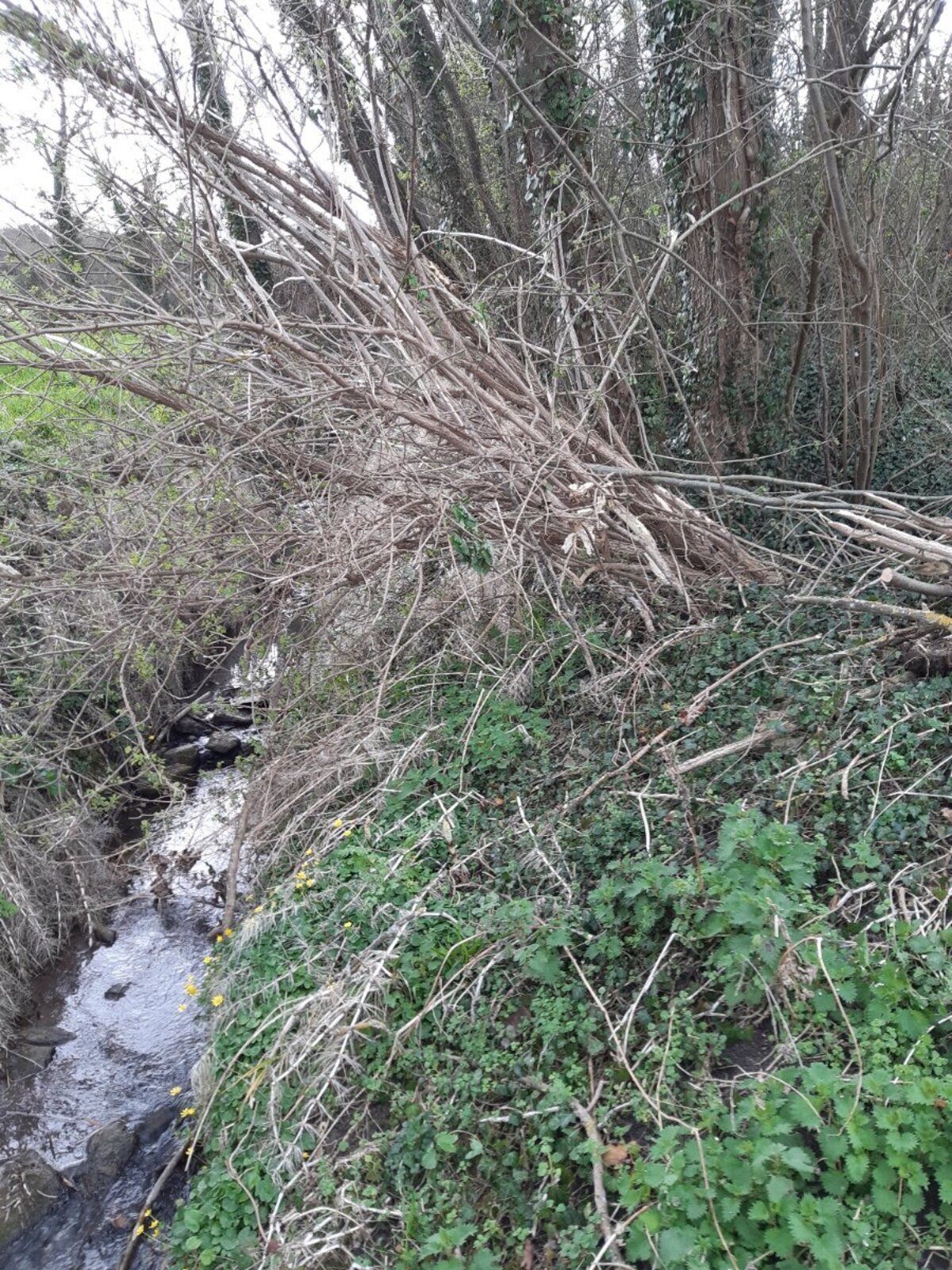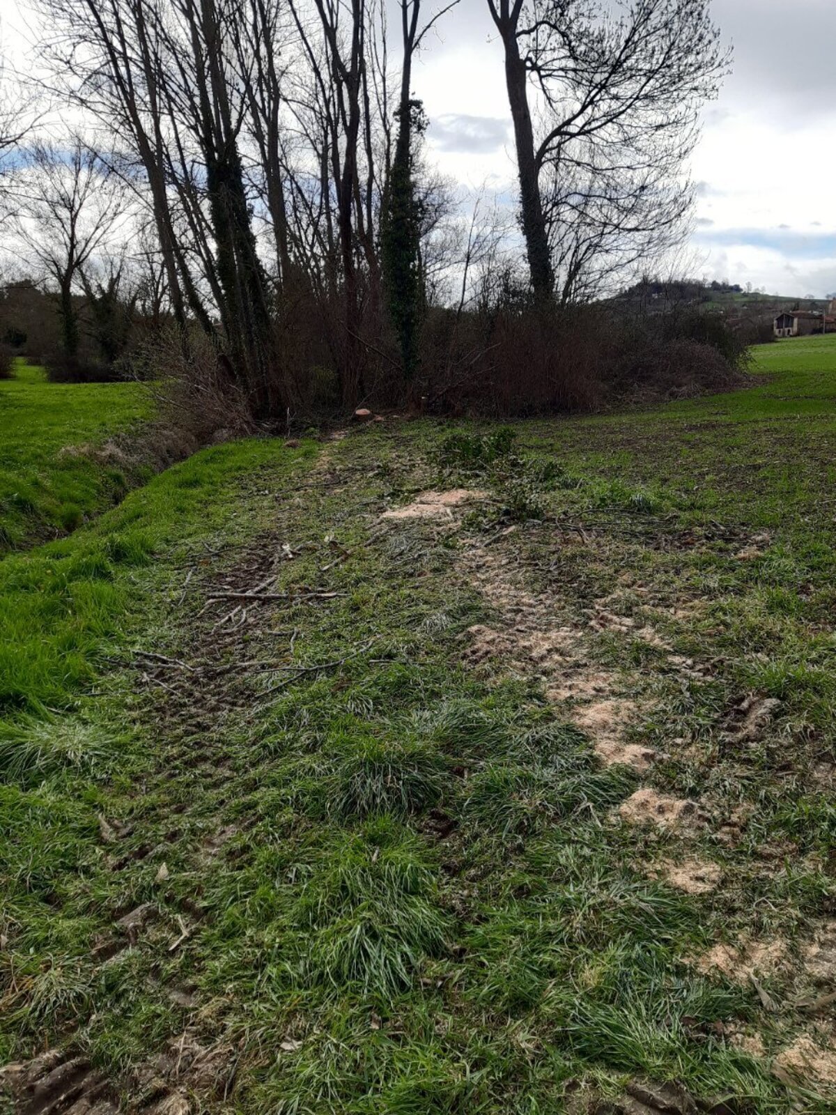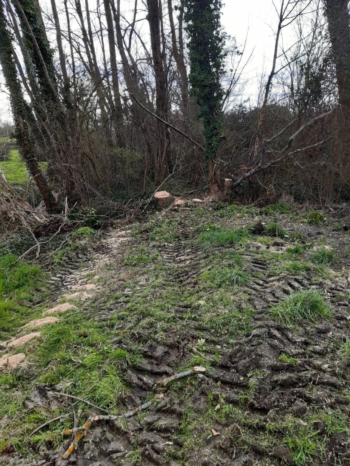 Destruction en cours d'une haie en bord de ruisseau avec coupe d'arbres.