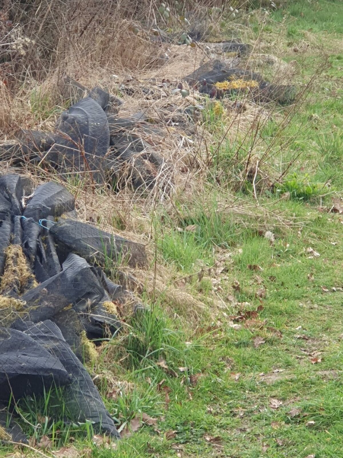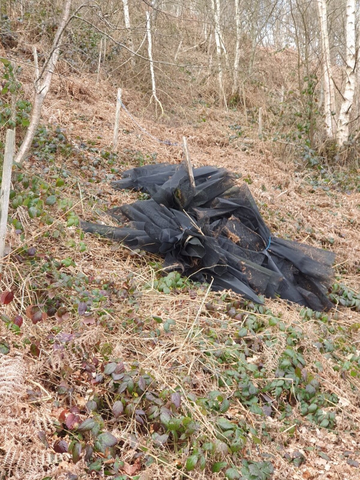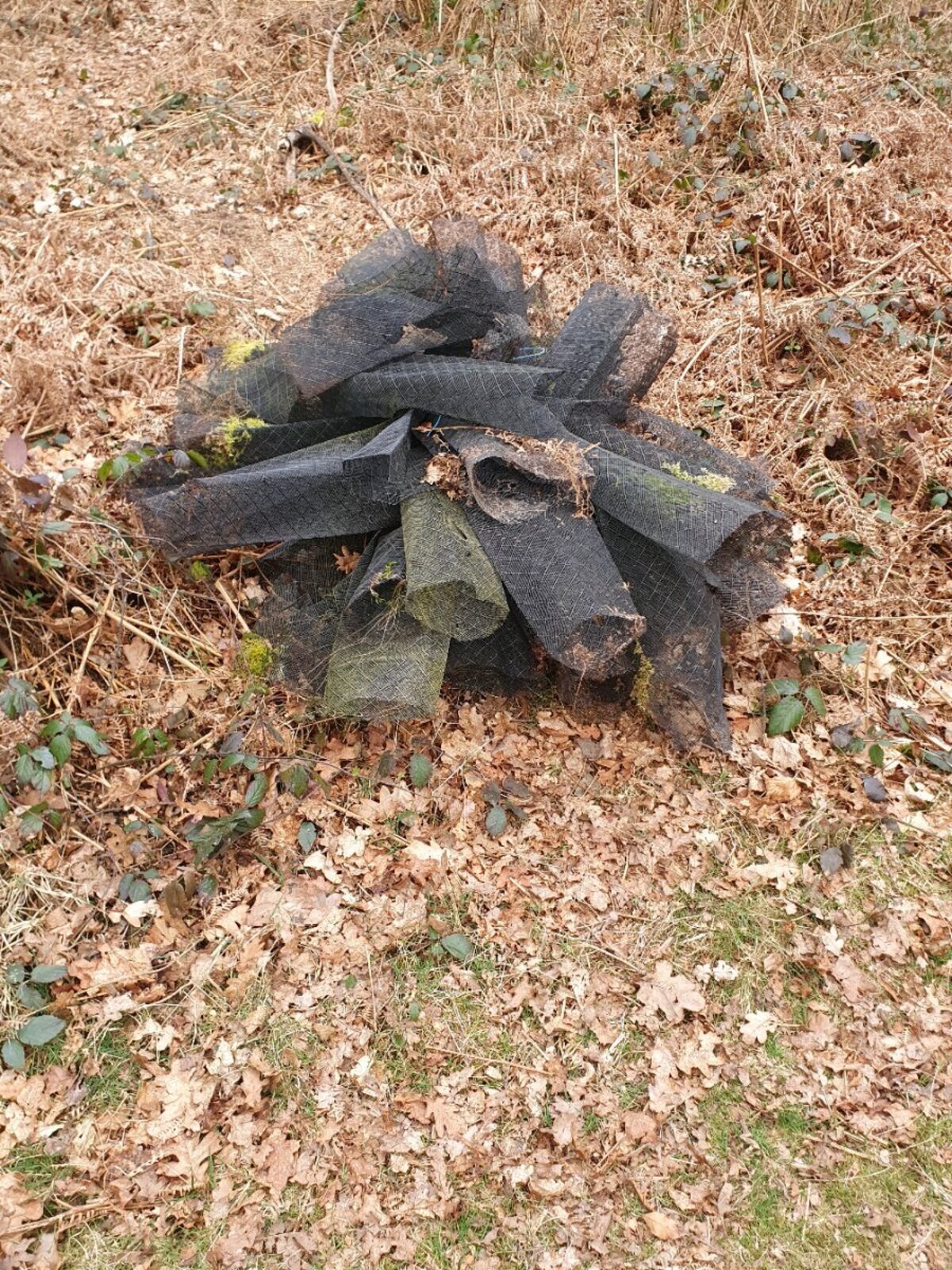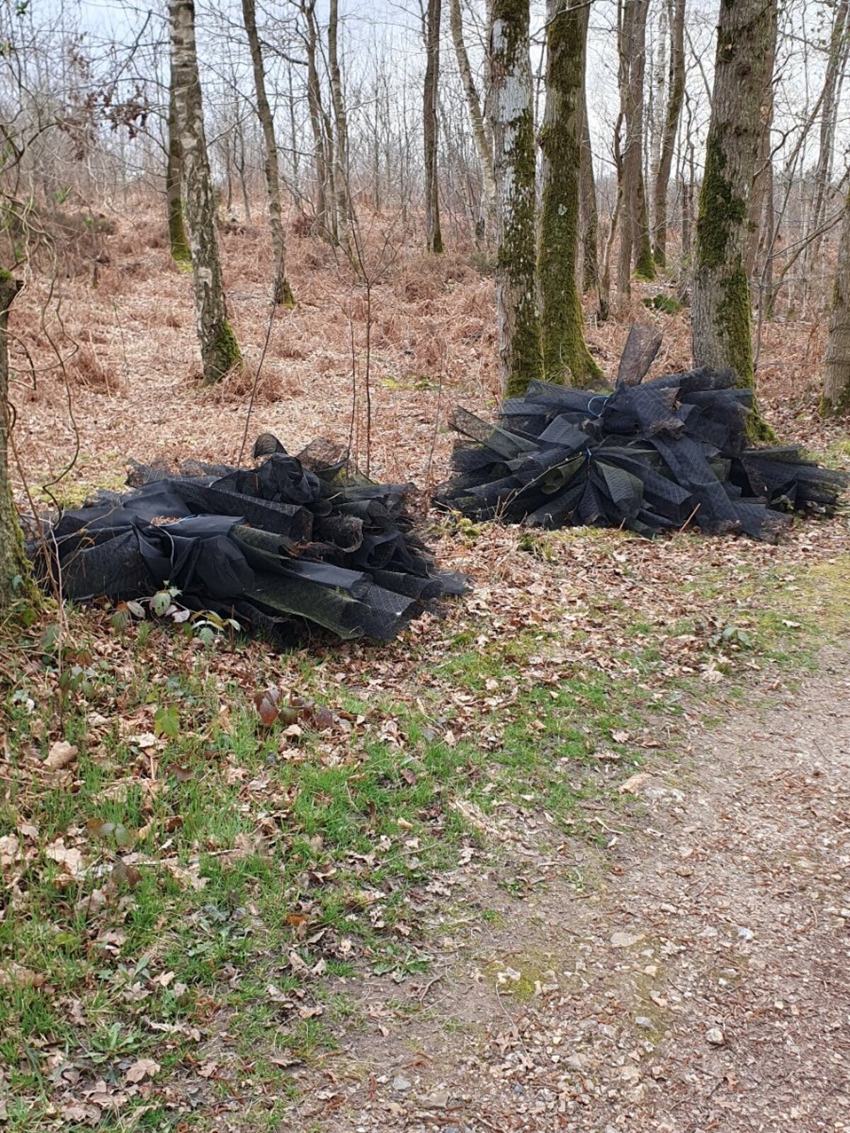 Dépôt d'un tas de manchons de plastique et de déchets (ce sont les éléments qui entourent les arbres)
