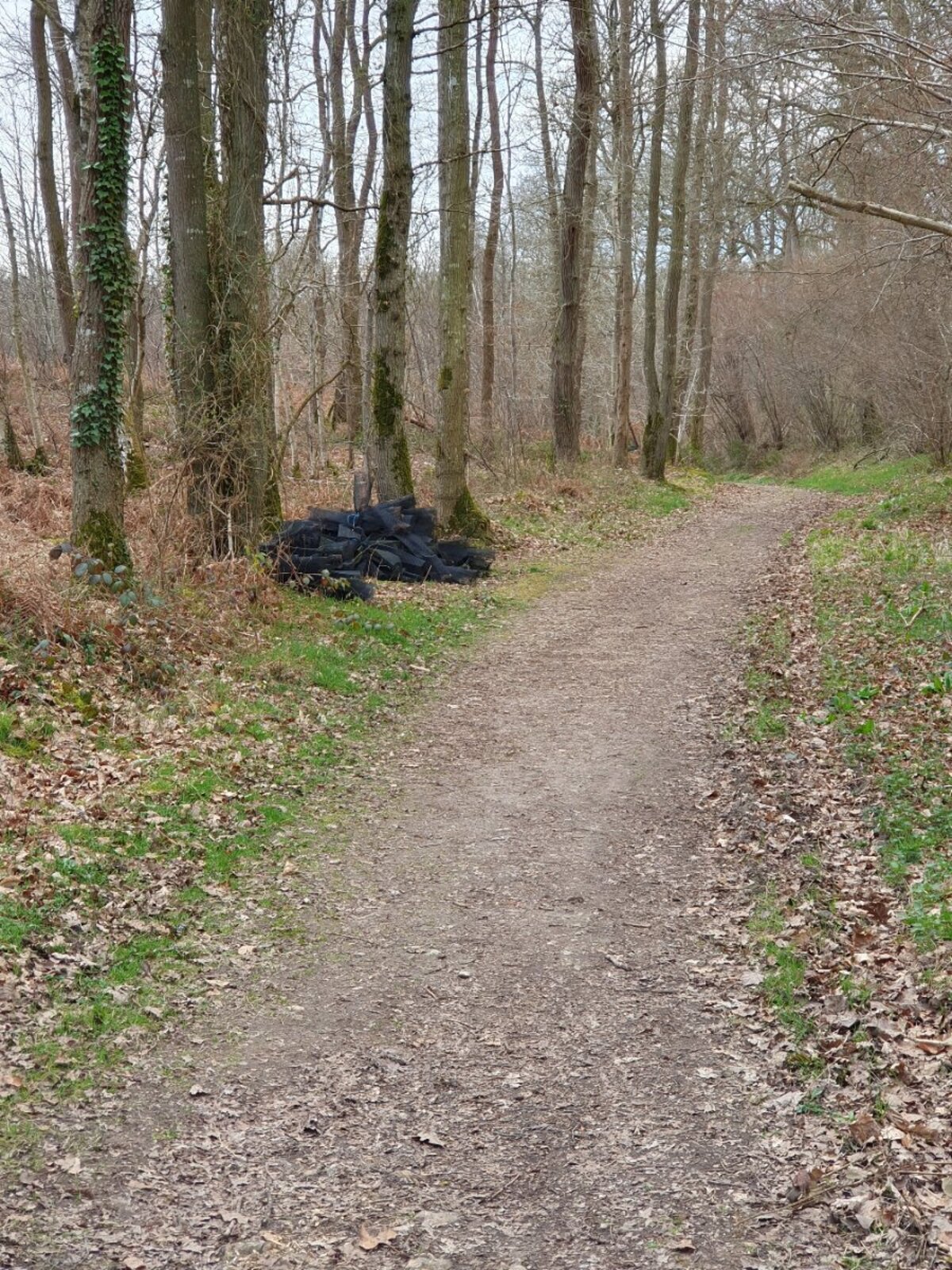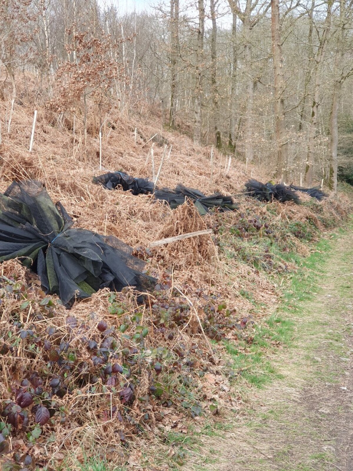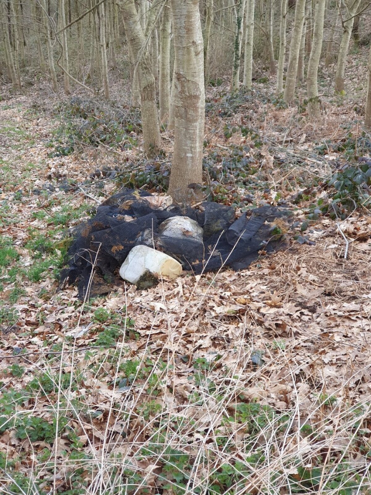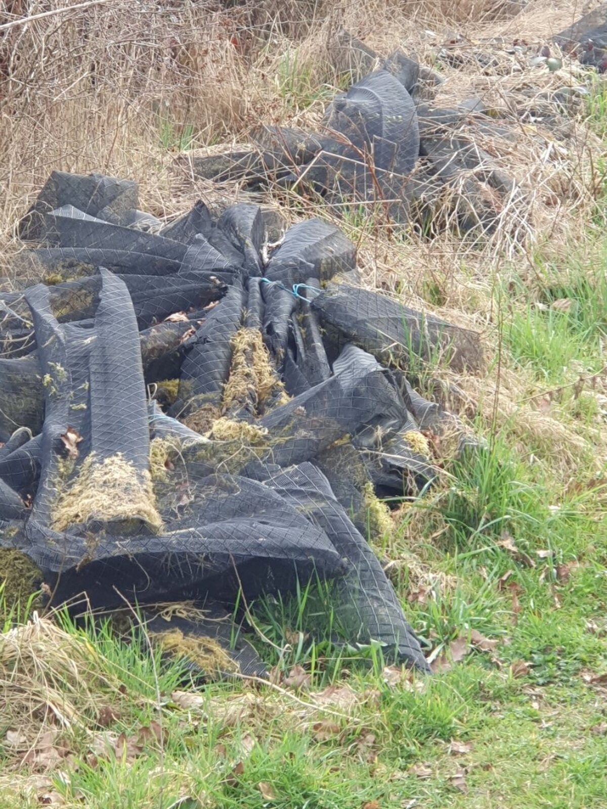 Dépôt d'un tas de manchons de plastique et de déchets (ce sont les éléments qui entourent les arbres)