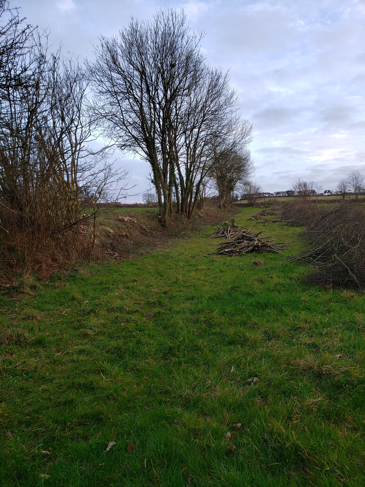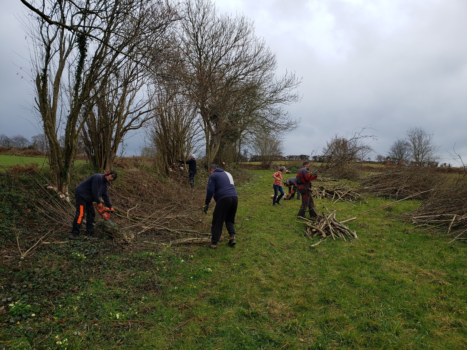 Chantier d'entretien du bocage, formation et réalisation du recépage de 300 m de haie bocagère réalisé sur 2 jours dans le cadre du programme "Mains dans le Bocage" d'Eau et Rivières de Bretagne.