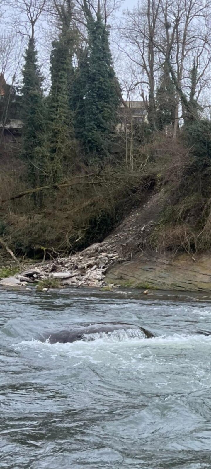 Des dépôts situés sur la partie supérieure de la parcelle, en haut du lit du Fier, ont été identifiés et nettoyés. En revanche, les gravats présents en contrebas, directement dans le lit du cours d’eau, se trouvent dans une zone très escarpée et difficile d’accès. Leur enlèvement nécessite des moyens techniques et financiers importants, plus complexes à mobiliser pour le propriétaire comme pour la collectivité.
