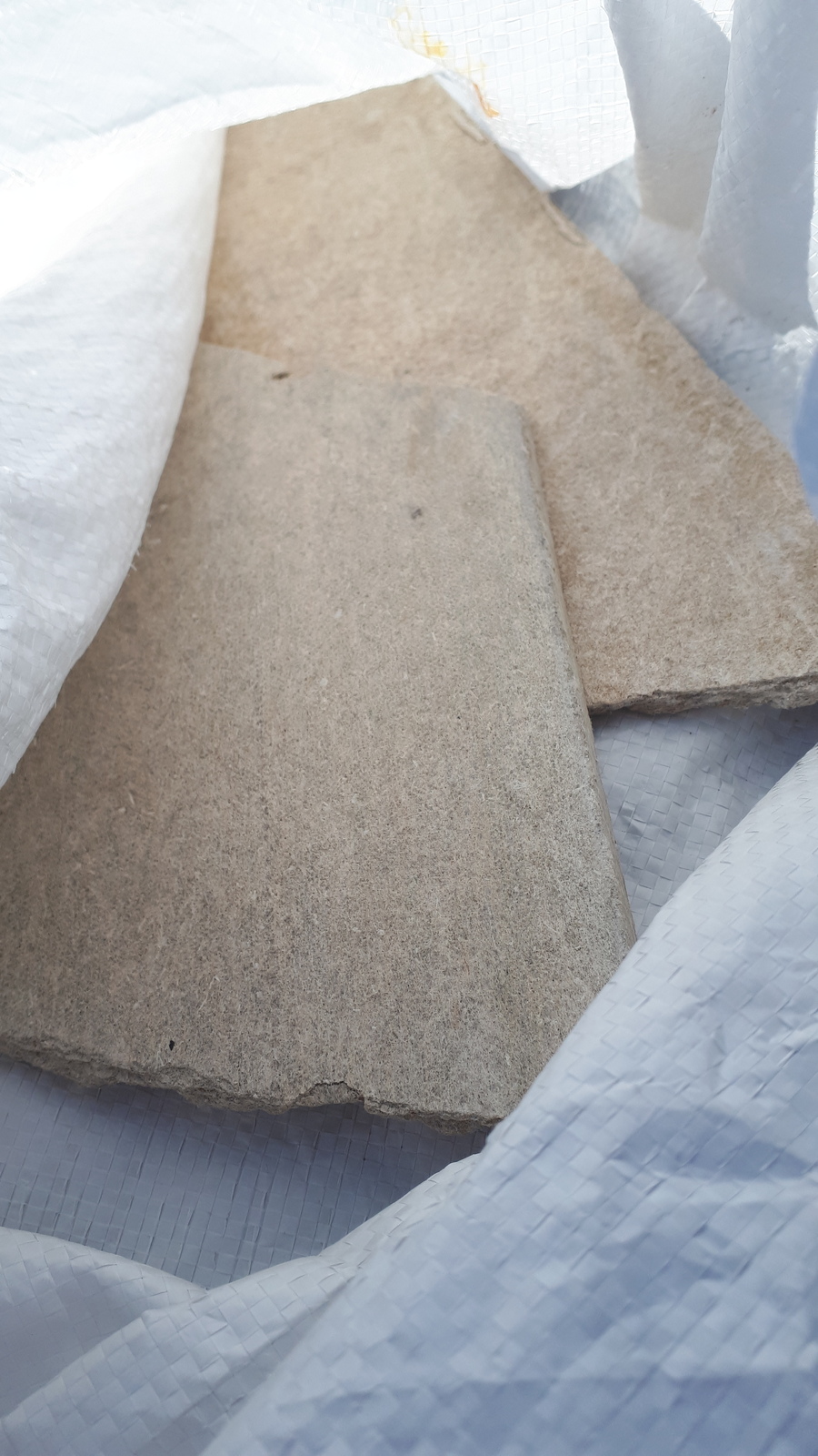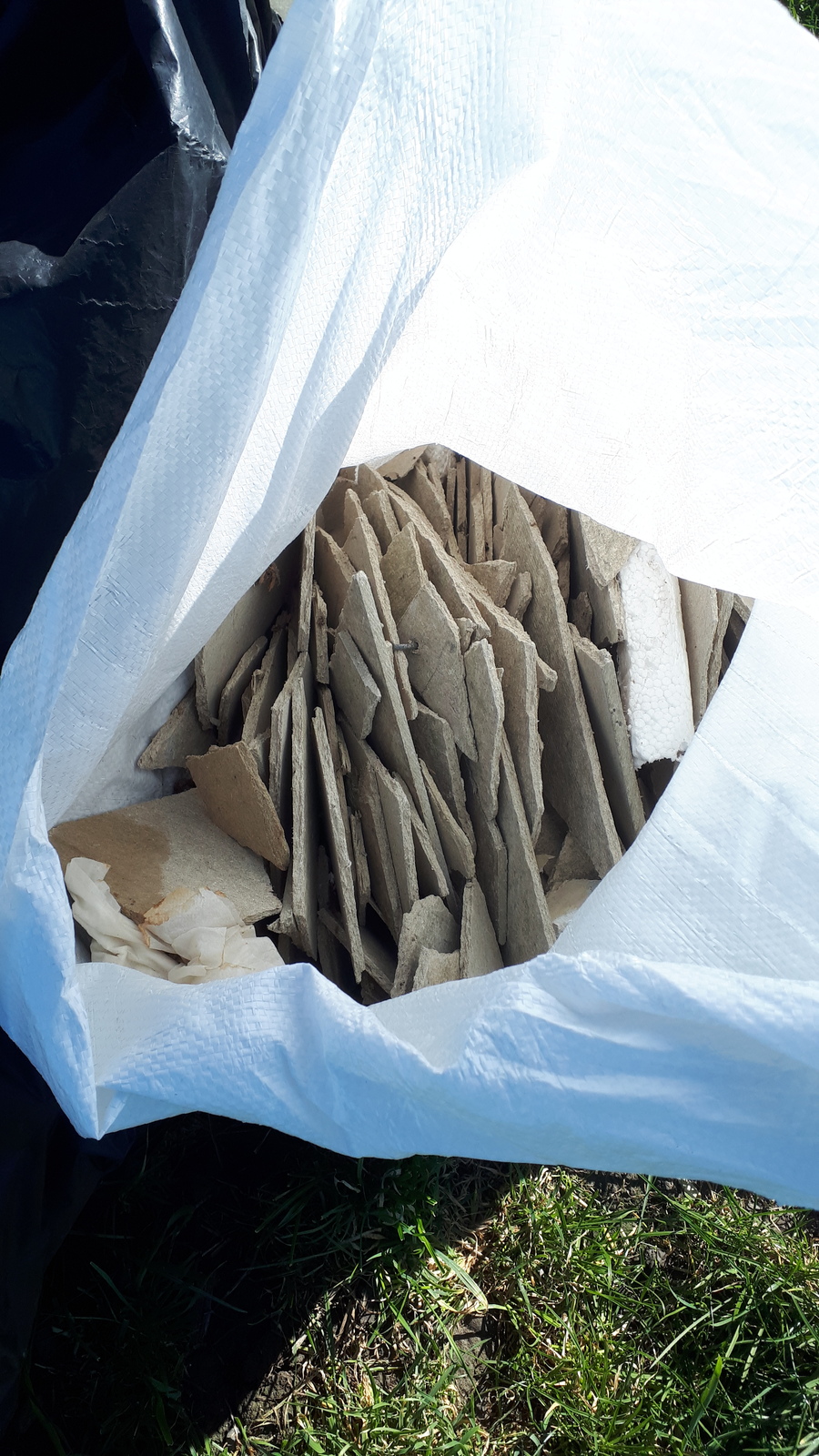 Nombreux sacs contenant des déchets potentiellement amiantés (plaques morcelées).
