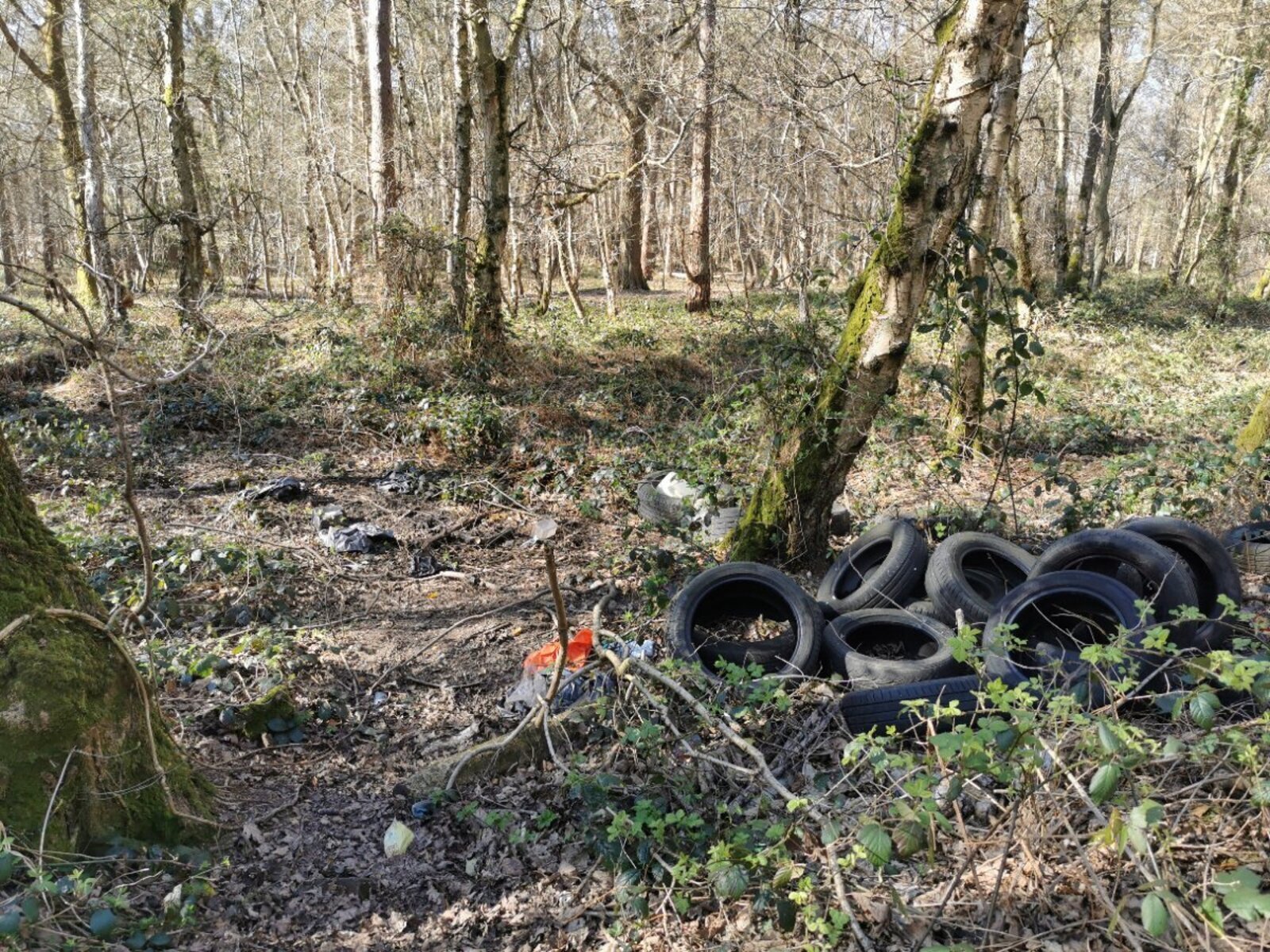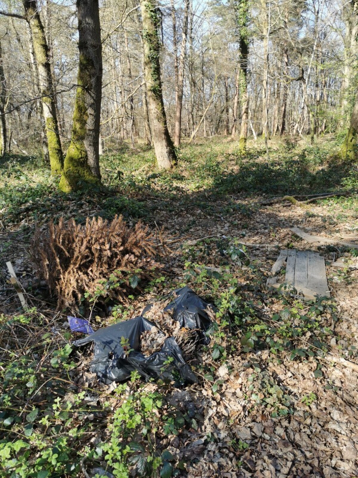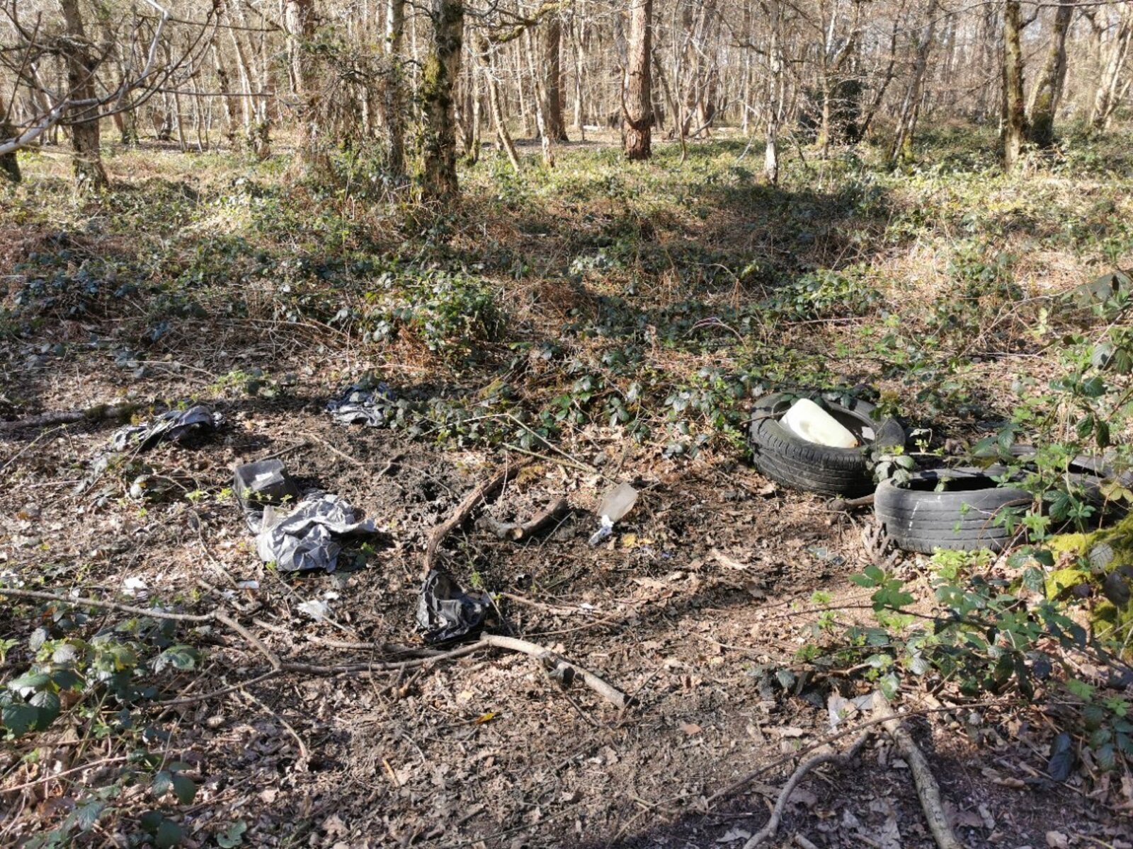Zone de dépôts fréquents et imposant au bord de la forêt: présence ici de pneus, sapin, os d'animaux, plastiques. Un réel problème de dépôt existe sur cette zone de la forêt, les dépôts sont systématiques. Aucun technique de dissuasion ne semble être présente.