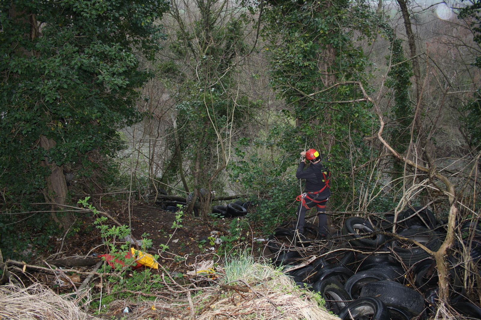 Il a fallut que les membres du Groupe Spéléo Auvergnat se sécurisent avec des cordages pour remonter certains pneus, via une poulie, qui se situaient dans une zone particulièrement engagée.