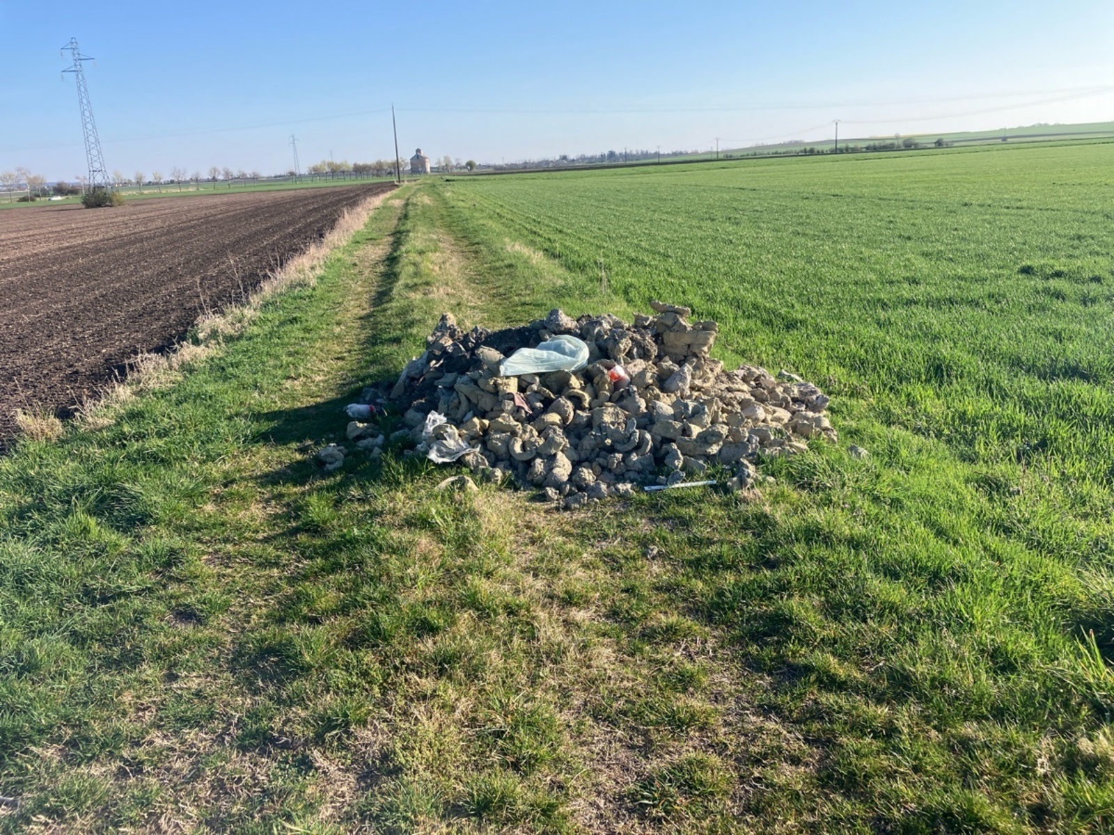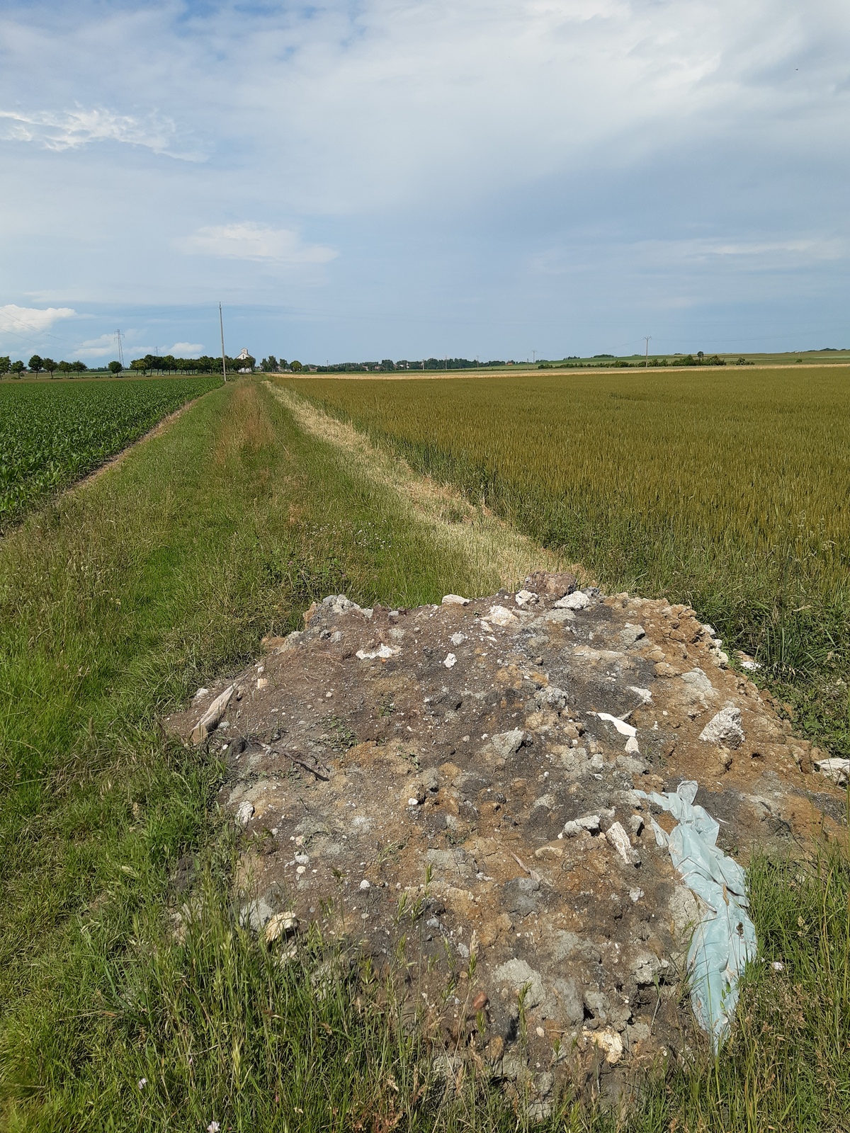 Amas de gravats sur un chemin communal, accompagnés de divers déchets ménagers.