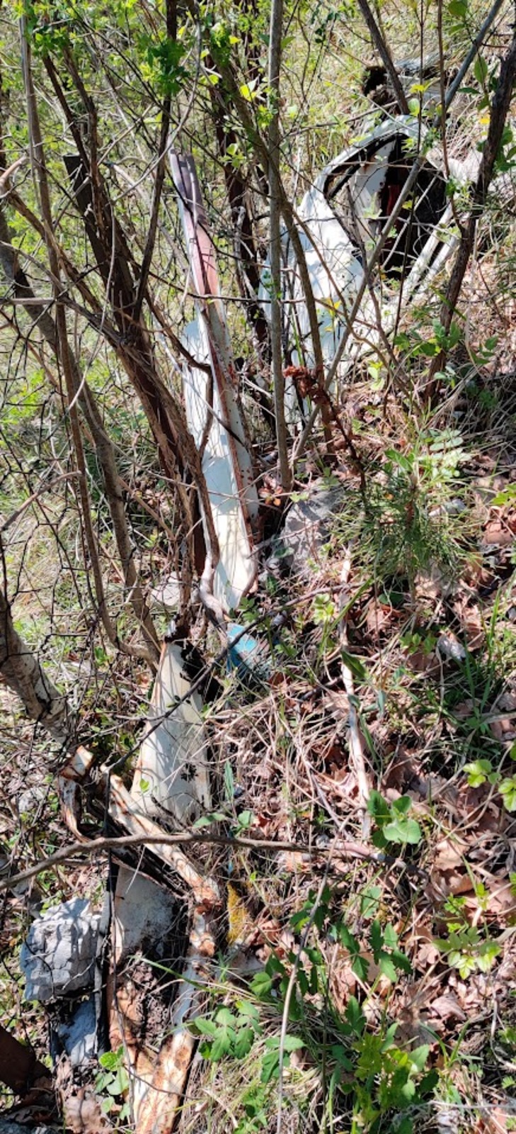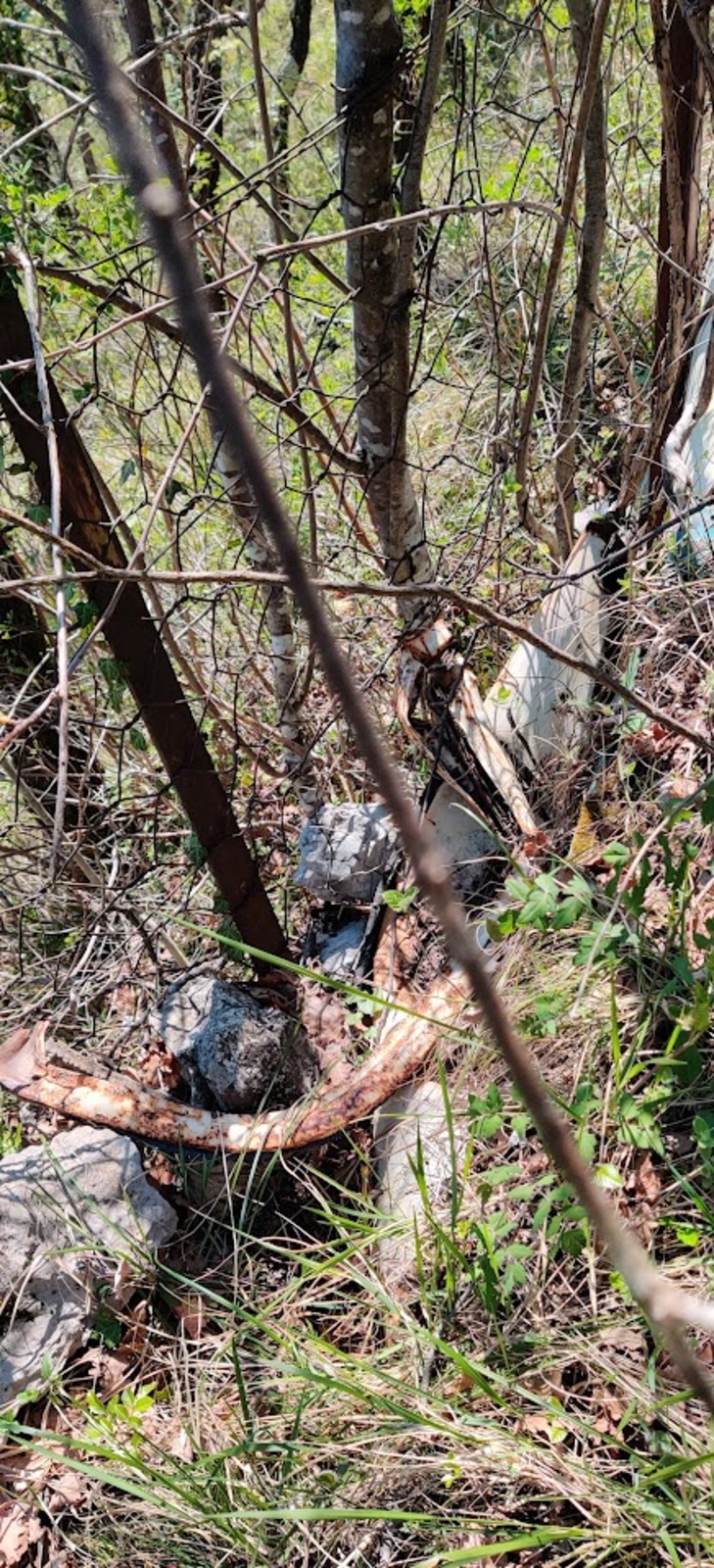 Dépôt ancien, partiellement enfoui sous le sentier.