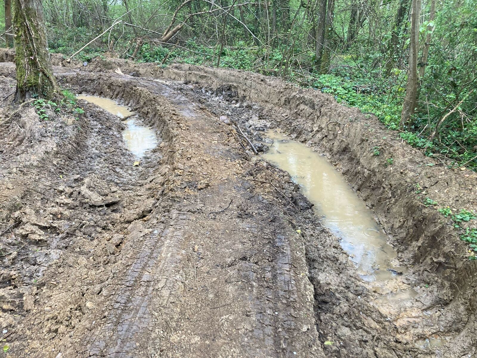 Après une intervention d'une entreprise forestière pour la coupe d'arbres en forêt, l'évacuation des grumes s'est faite sur un chemin communal et a causé des ornières de plus d'un mètre et une dégradation générale sur plusieurs centaines de mètres. Cela a rendu le chemin impraticable, notamment aux randonneurs et aux vélos, dont la fréquentation est fréquente.