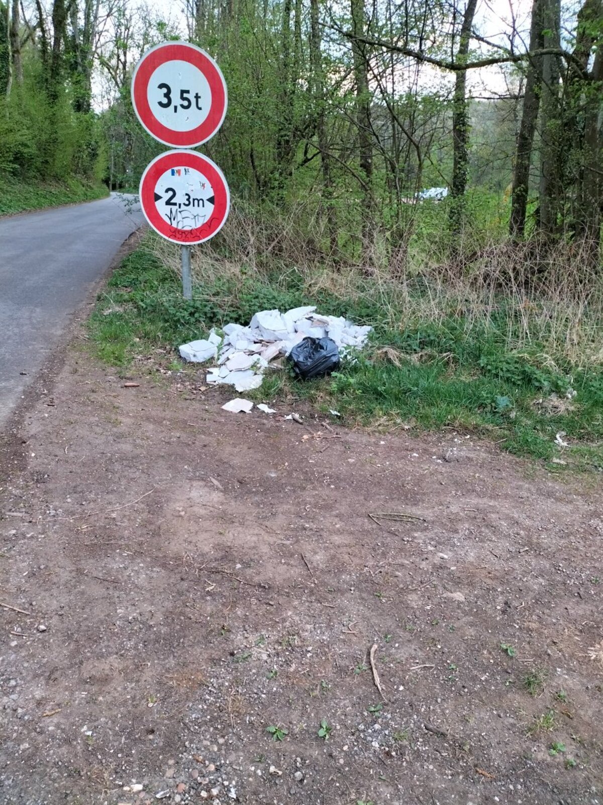 Dépôt sauvage de divers déchets : sac poubelle, blocs de polystyrène etc. au bord d'une route.