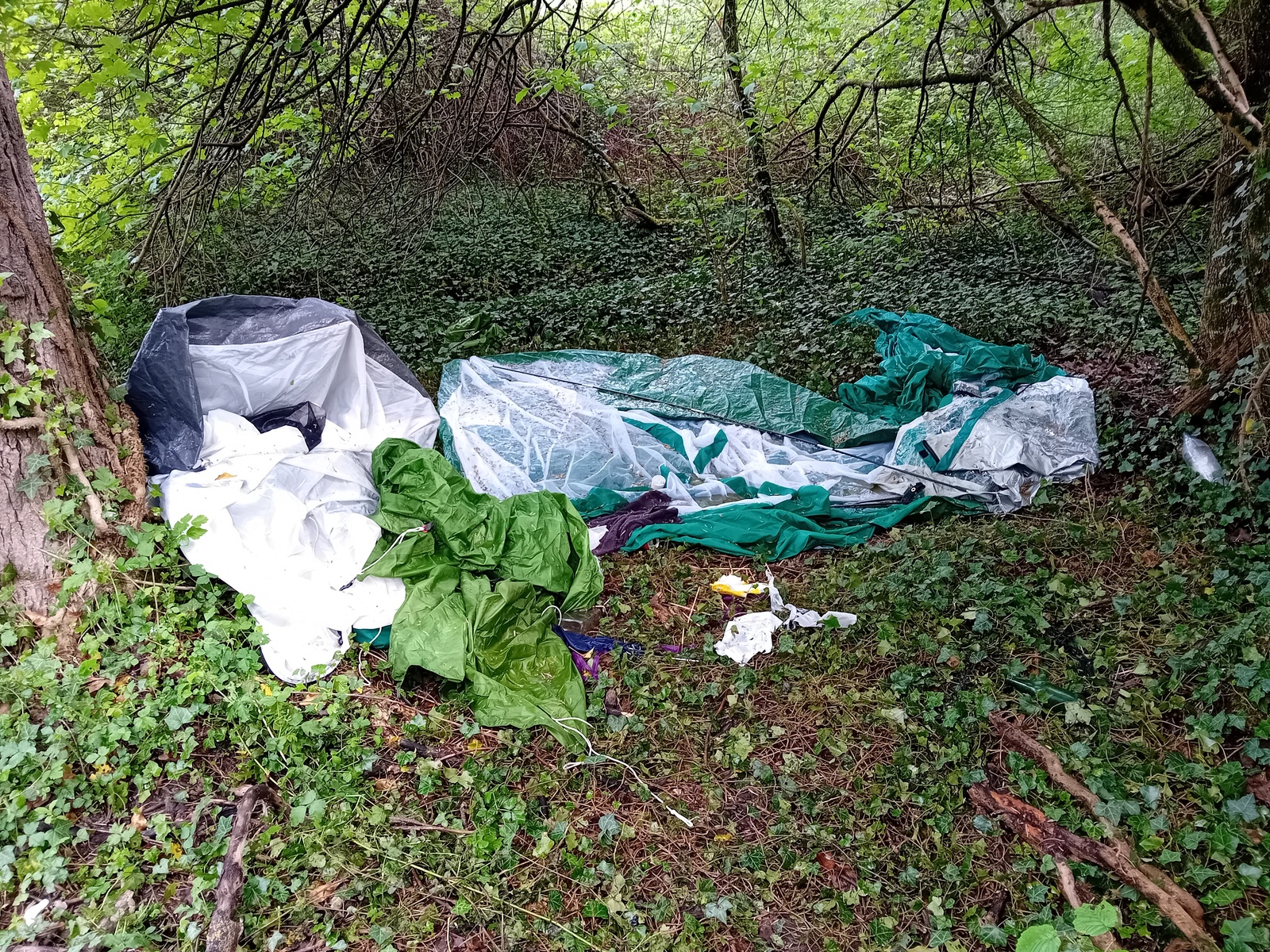 Matériel de camping (tente) et divers déchets suite à un bivouac