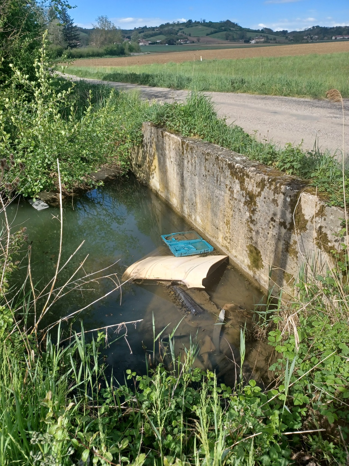 Déchets en plastique dur dans un bras d eau, juste à côté d une petite route