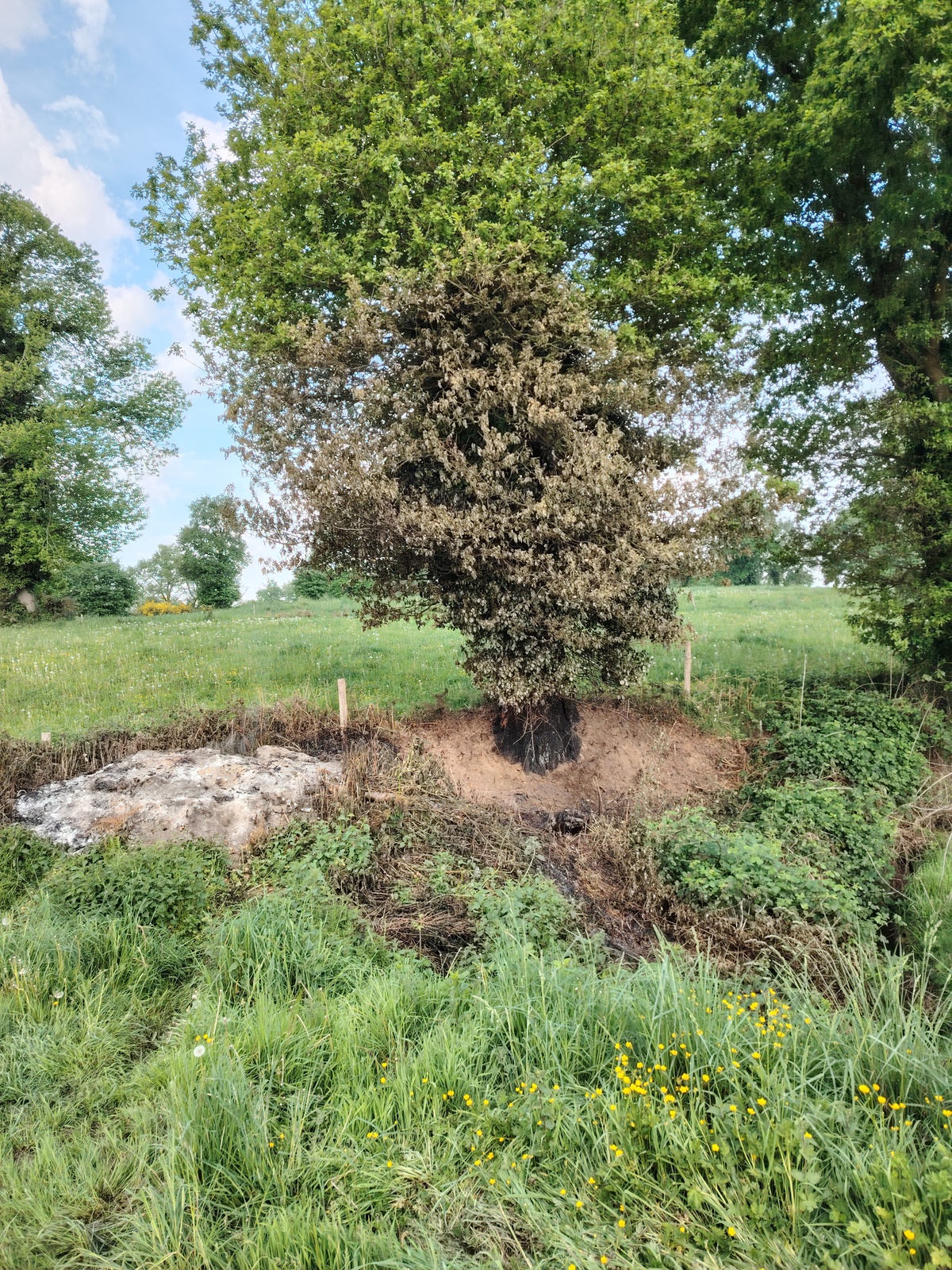 Feu de déchets au pied d'un vieux chêne, qui est brûlé sur toute sa moitié inférieure y compris son tronc. Coulée de cendre dans la rivière. Dans ce secteur il est interdit de couper les arbres.