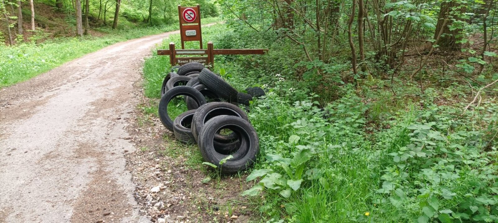Dépôt d'une trentaine de pneus en forêt.
