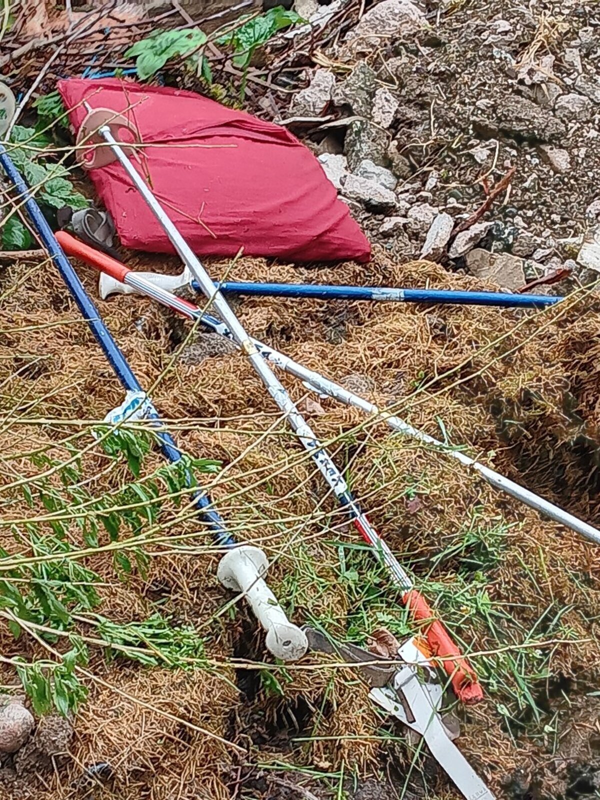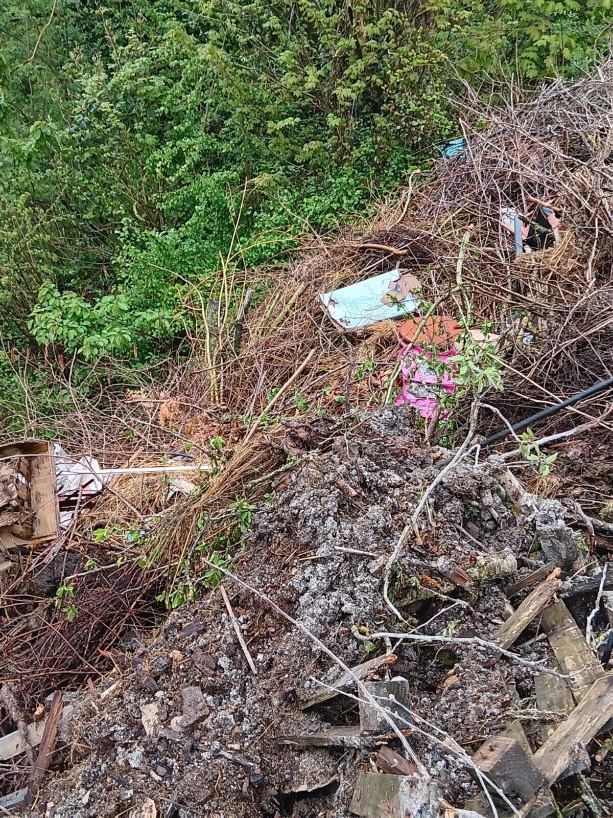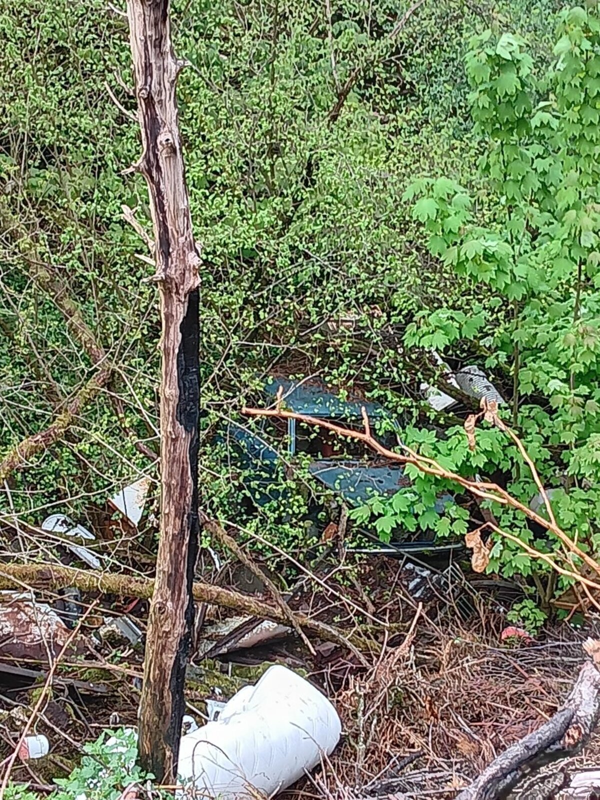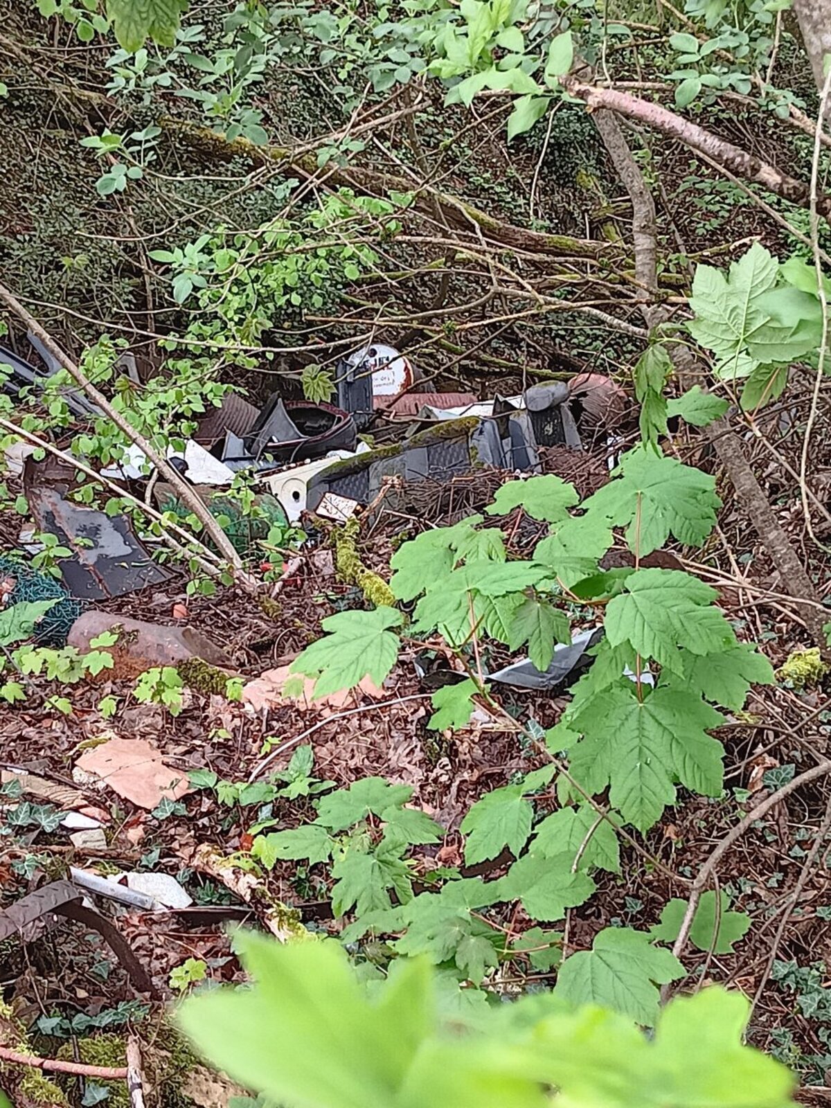 Décharge sauvage en forêt : dépôt de bidons, de plastiques, de filets, de voitures, de bâtons de marche etc.