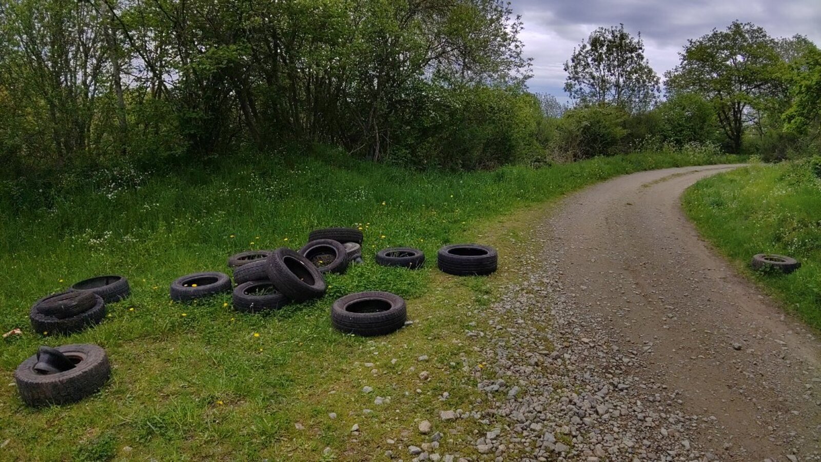 Une quinzaine de pneus déversés en plein milieu d'un chemin. Présence d'éléments métalliques.