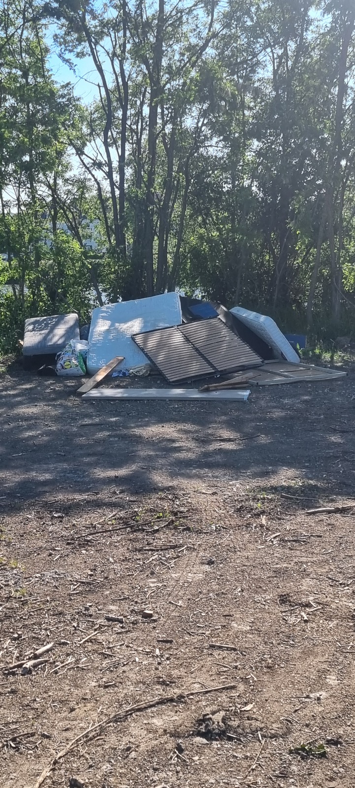 Dépôt sauvage de mobilier divers (sommiers, matelas) et autres déchets.