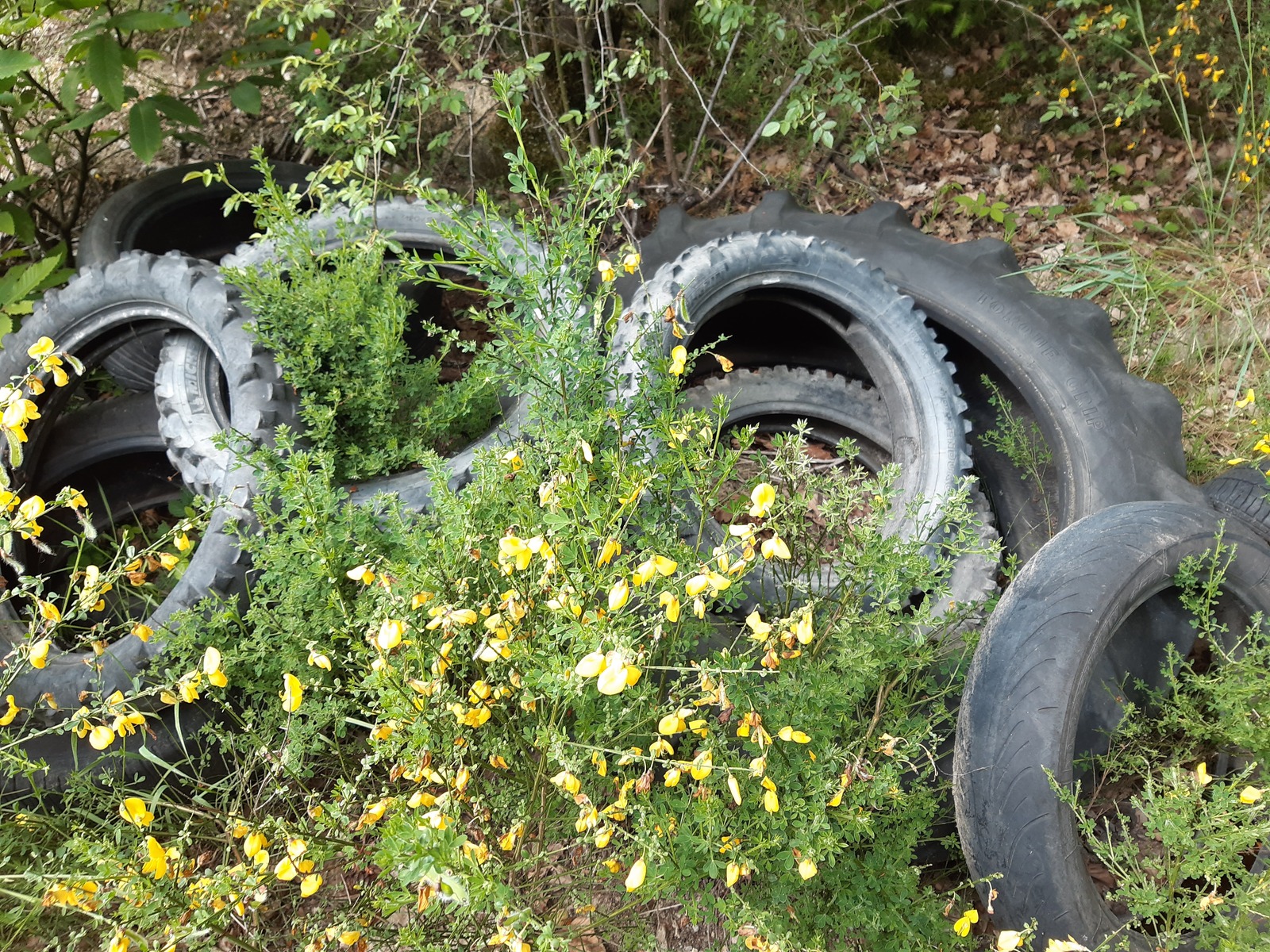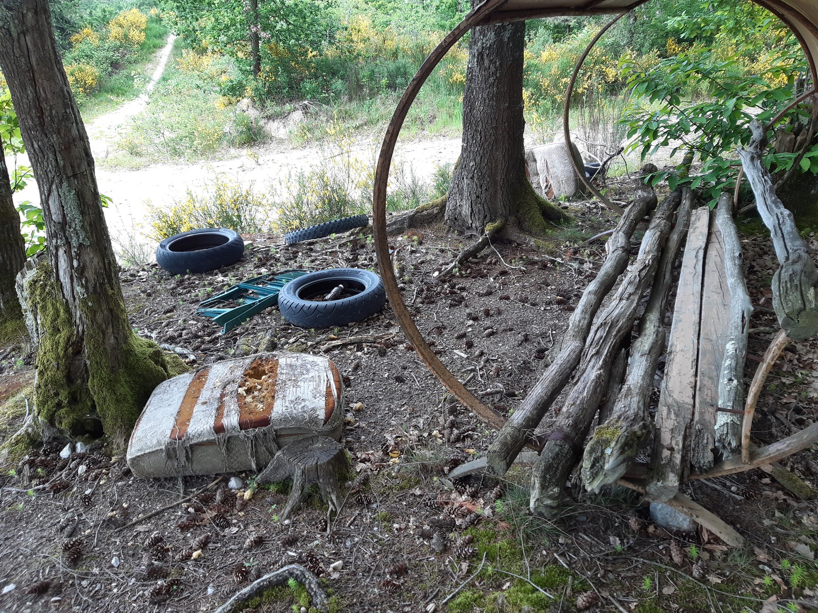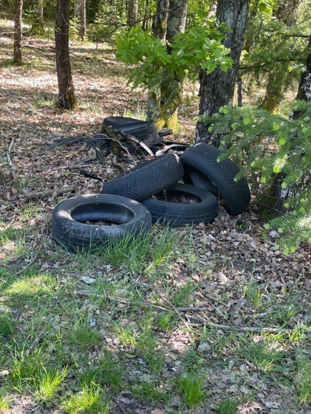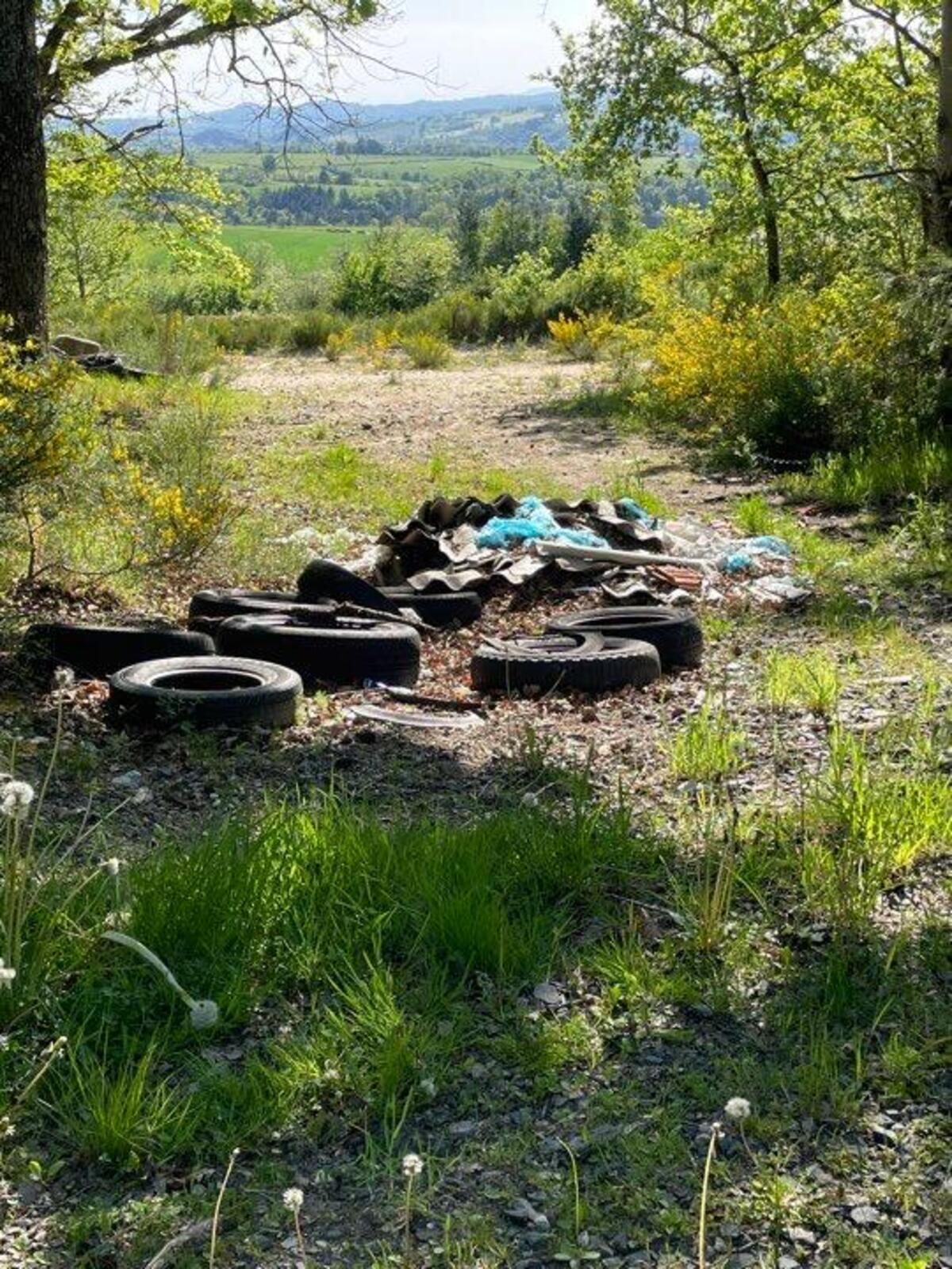 Décharge sauvage de pneus et divers déchets dont notamment des plaques de fibrociment susceptibles d'être amiantés.