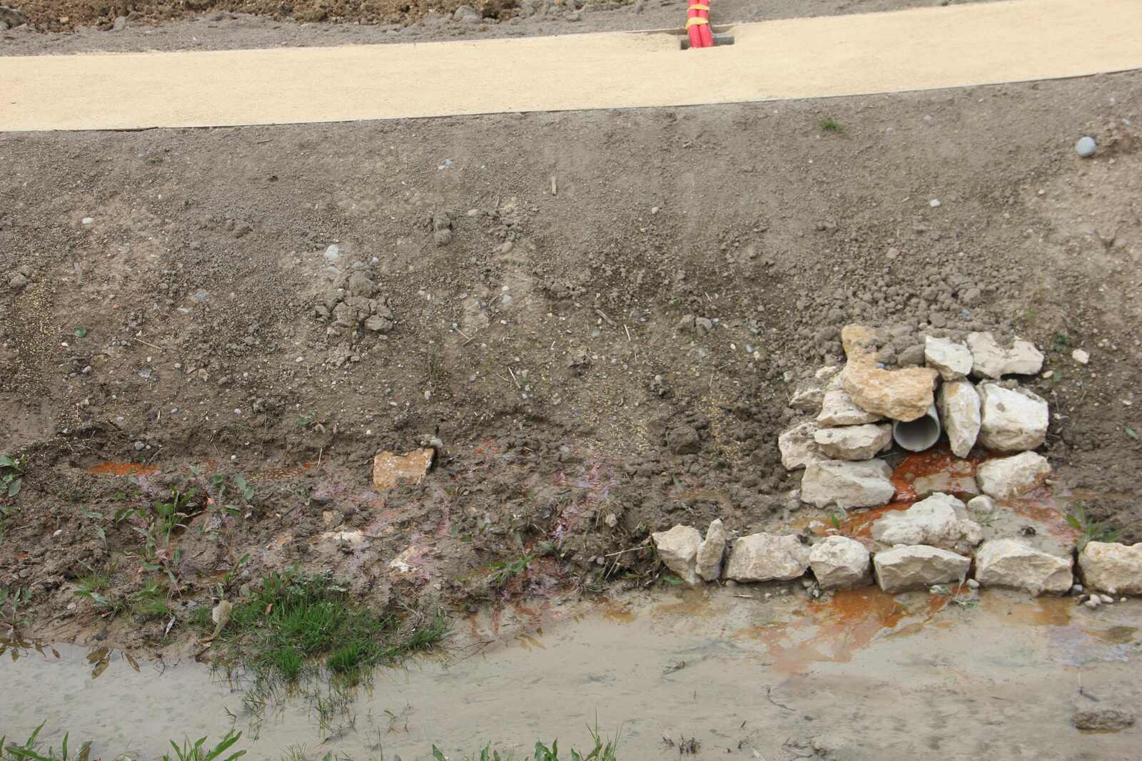 Ailleurs un liquide couleur rouille suinte et se déverse dans le lit prévu pour le ruisseau.