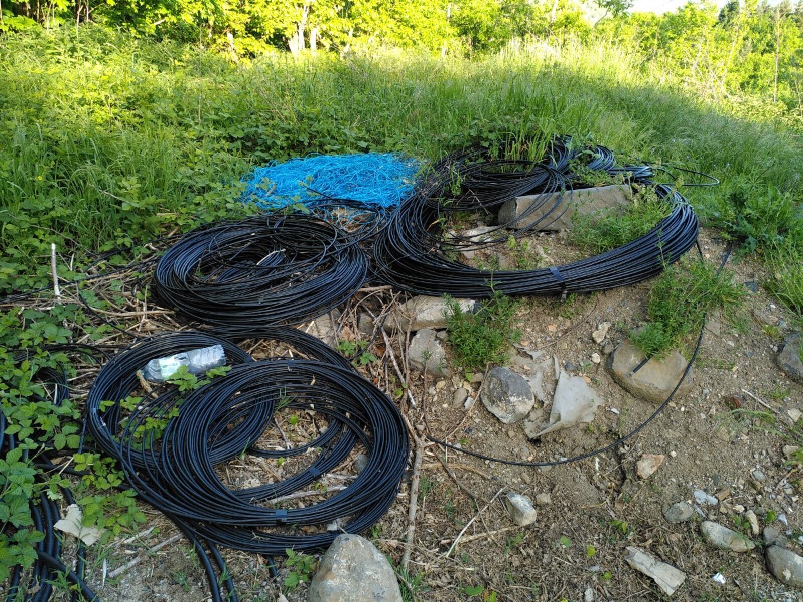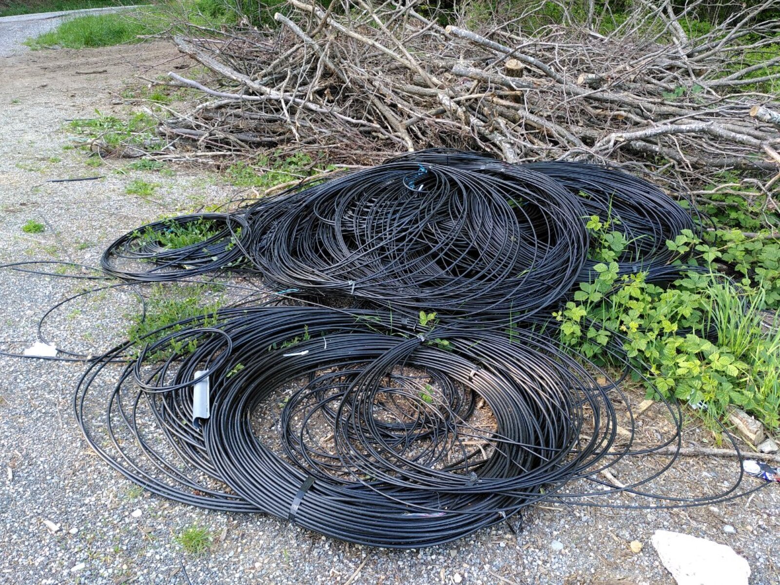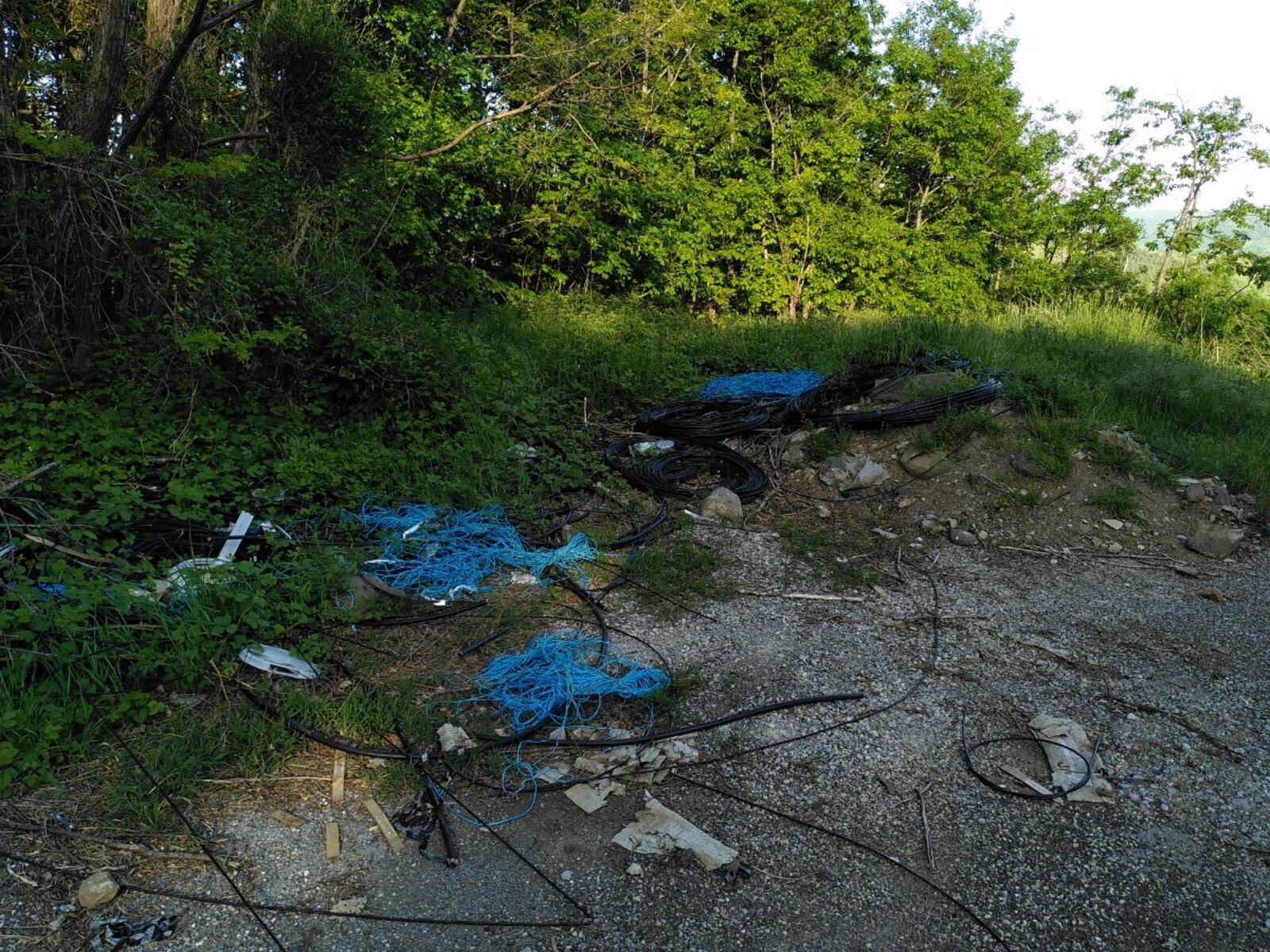 Dépôt important de fils électriques et de cordelettes synthétiques en pleine nature.