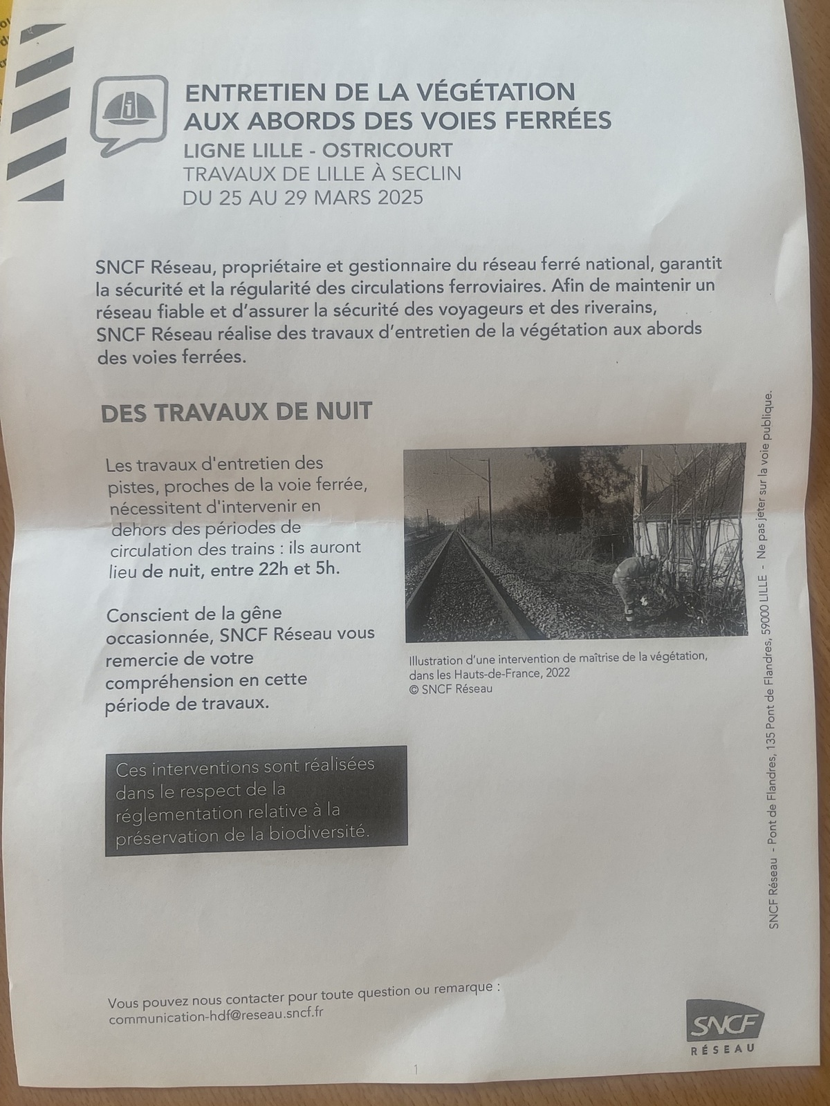 Je me permets d’attirer votre attention sur le bien-fondé de leur alerte qui reçoit mon plein et entier soutien, et je m’étonne personnellement de cette intervention au démarrage de la période de nidification des oiseaux alors même que sur son site internet, SNCF Réseau prétend "Préserver les ressources et la biodiversité".