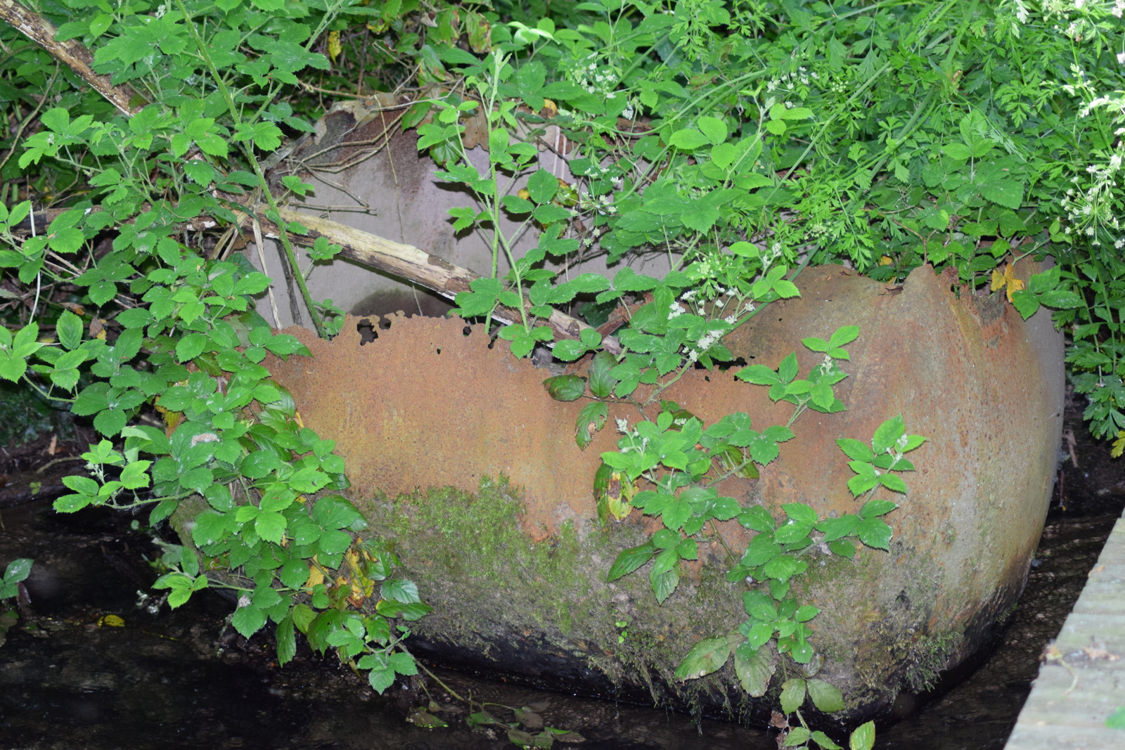 Une ancienne cuve à eau rouillée est dans le lit du cours d'eau.