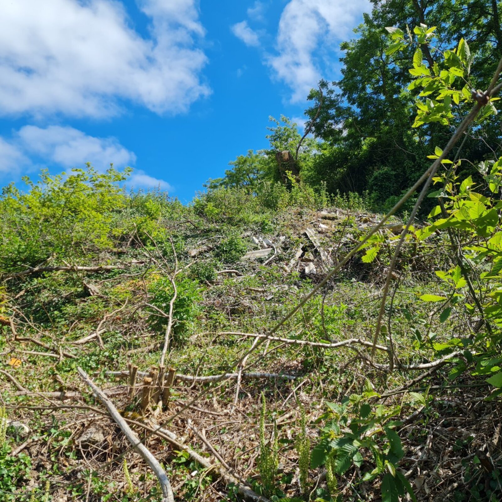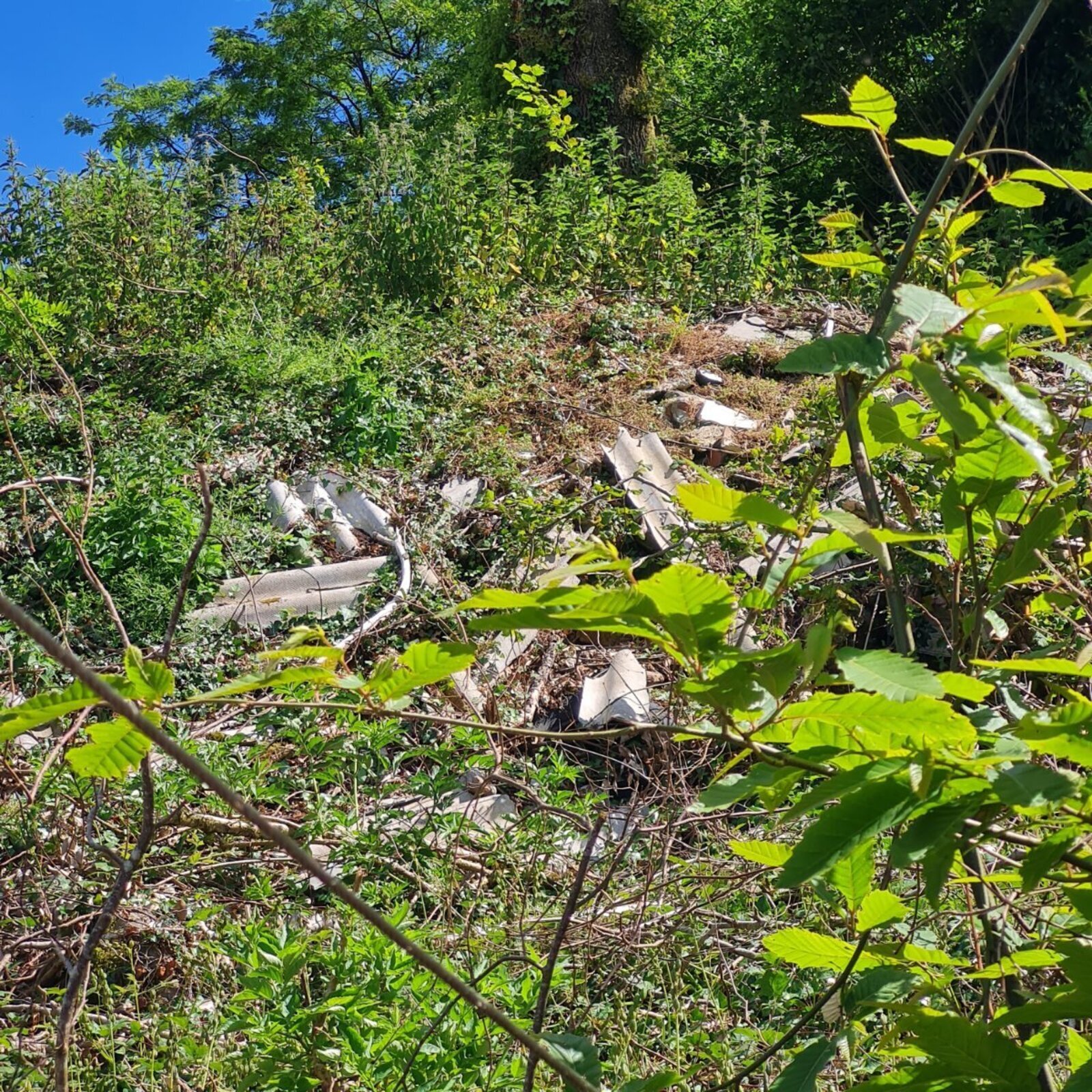 Abandon de panneaux de toiture en fibro-ciment, vraisemblablement de l'amiante. La végétation recouvre en partie les panneaux.