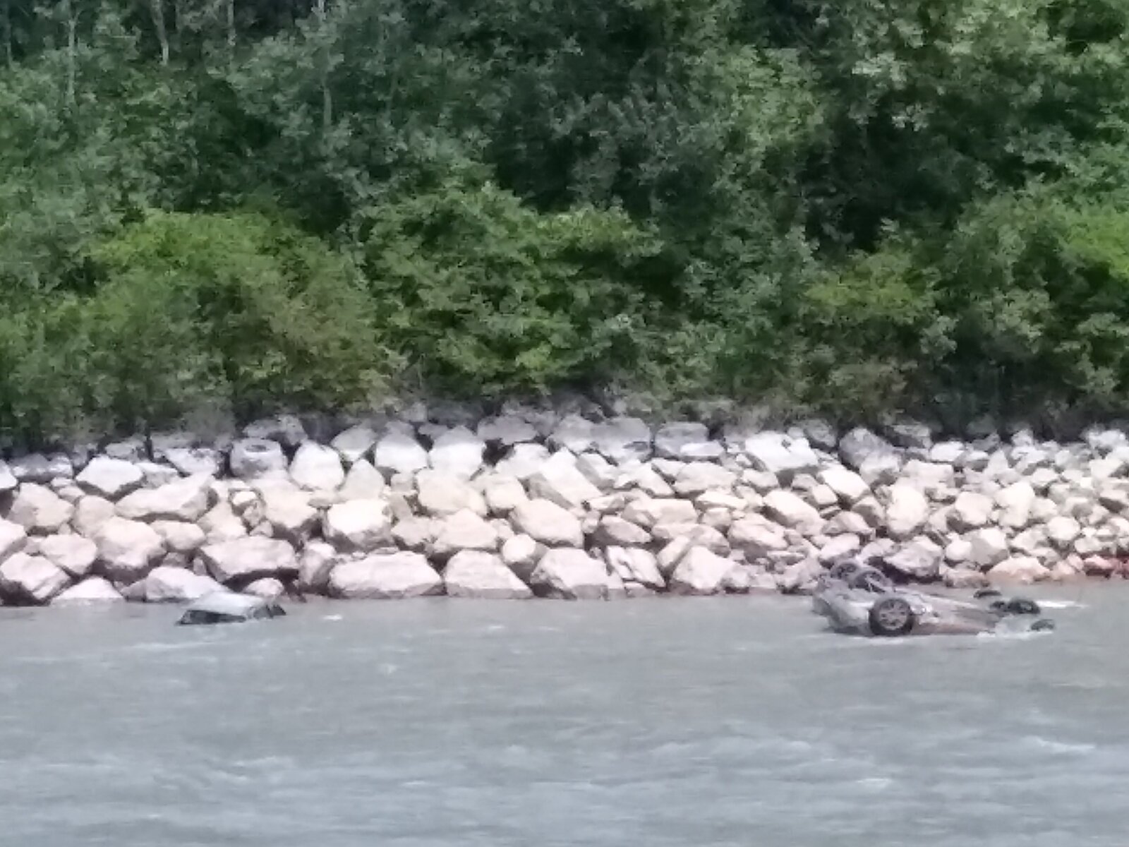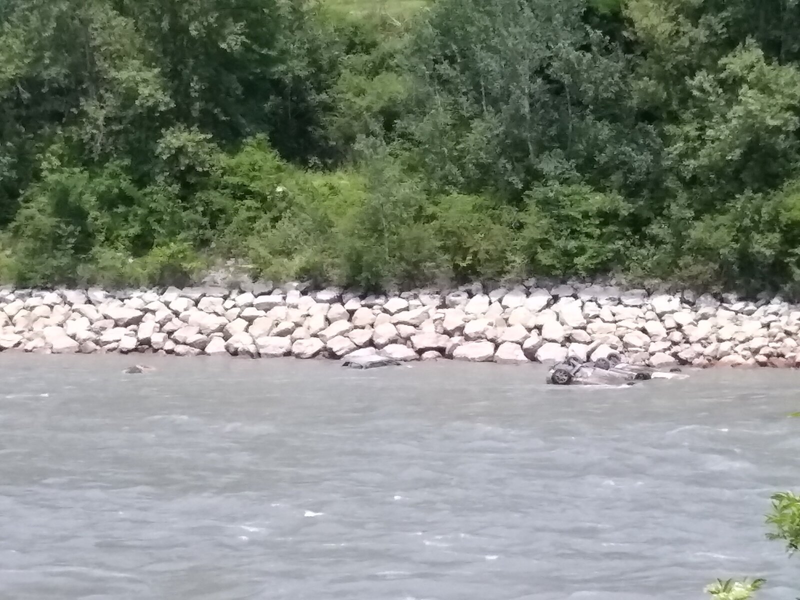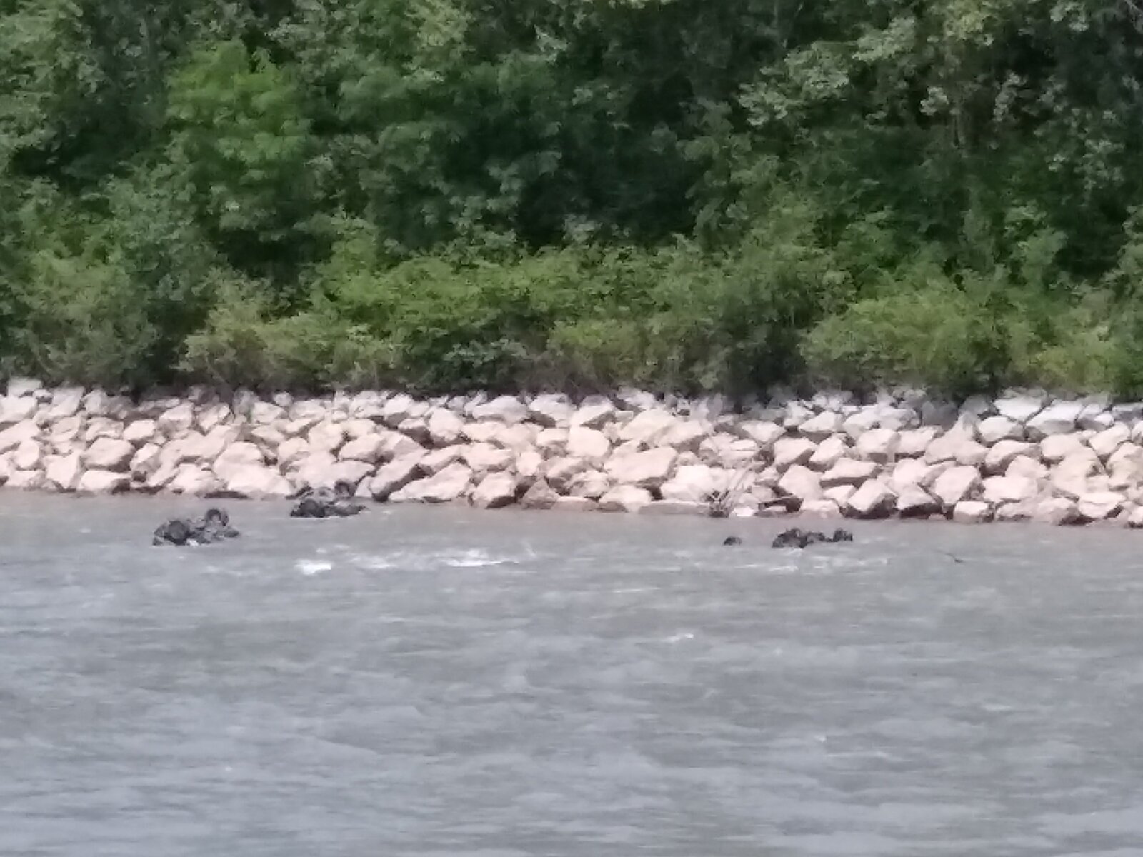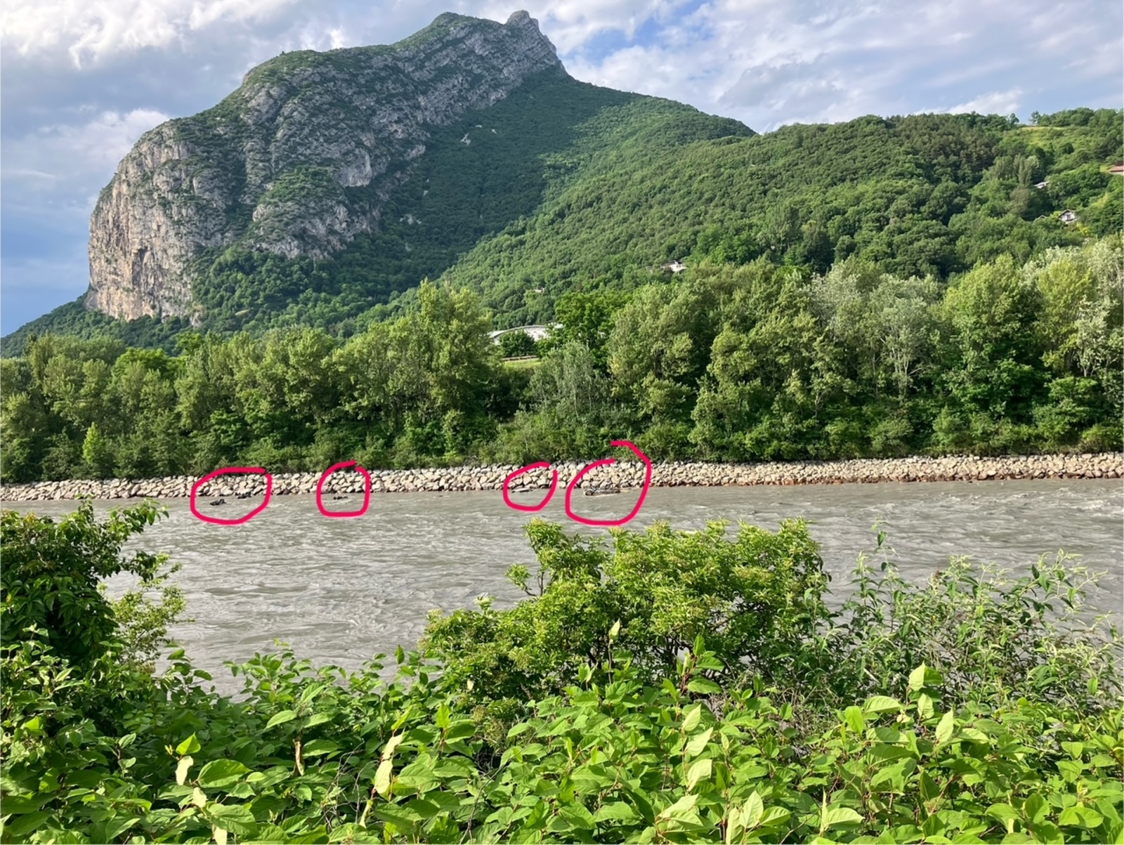 4 déchets de grande taille, probablement des carcasses de véhicules, observées depuis la rive gauche.