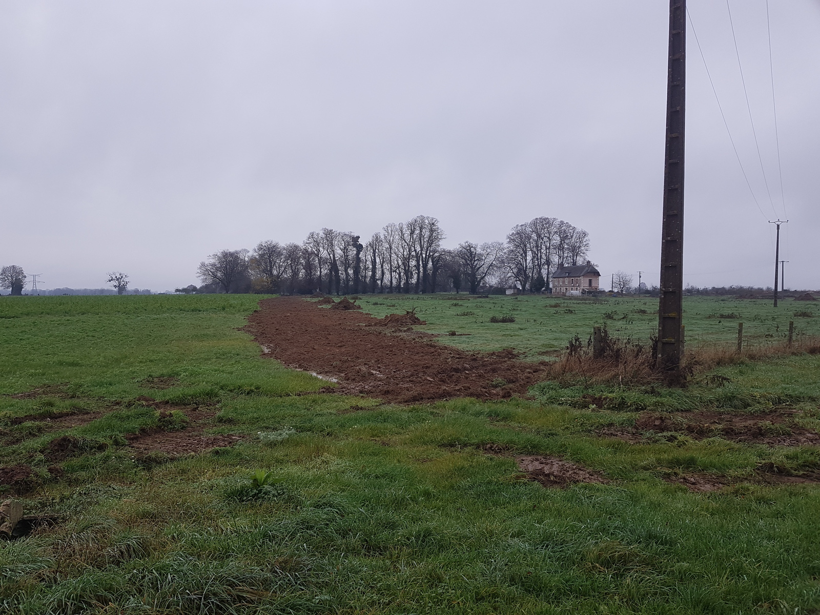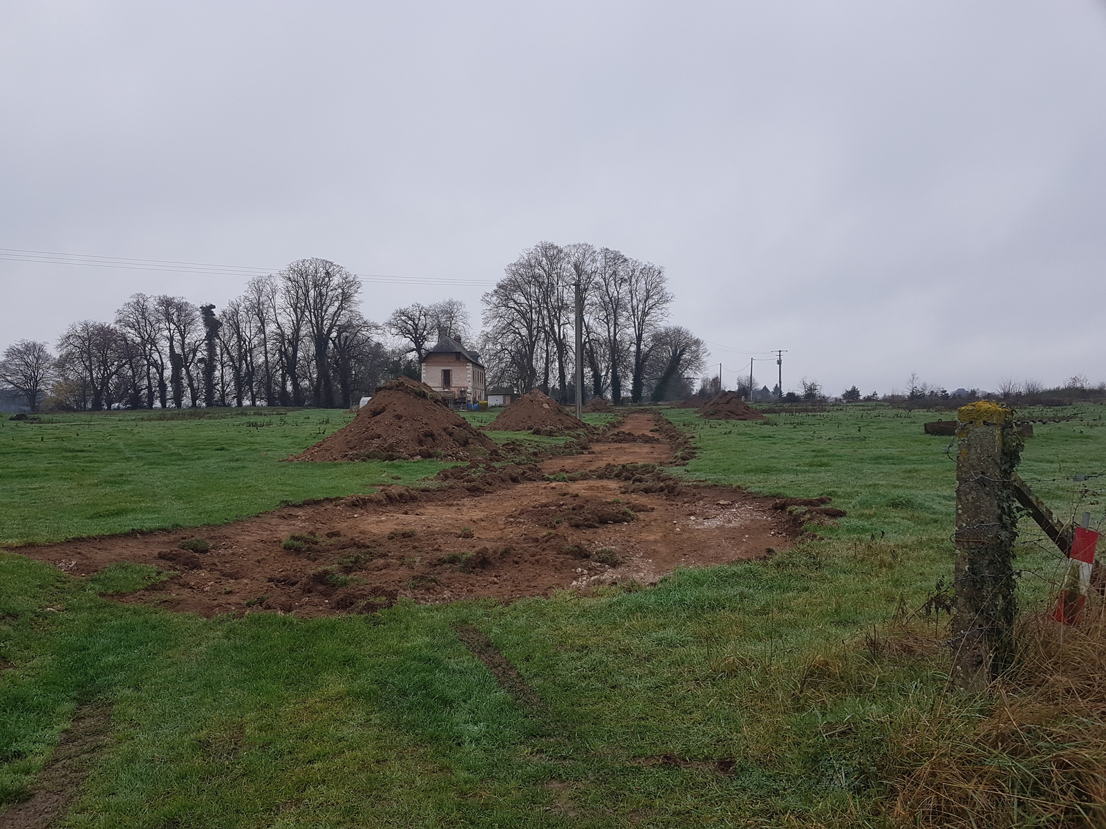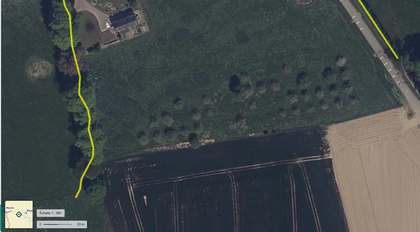 Arrachage d'un verger entier de pommier haute-tige, en période de nidification. En décembre, le talus au fond de la parcelle a été arasé et des travaux de voirie on été entrepris sur la parcelle supérieur (0123) sur le territoire de la commune de Hauville, en vu de la construction d'un bâtiment agricole, alors même que le permis de construire pour cette construction n'a pas été délivré.