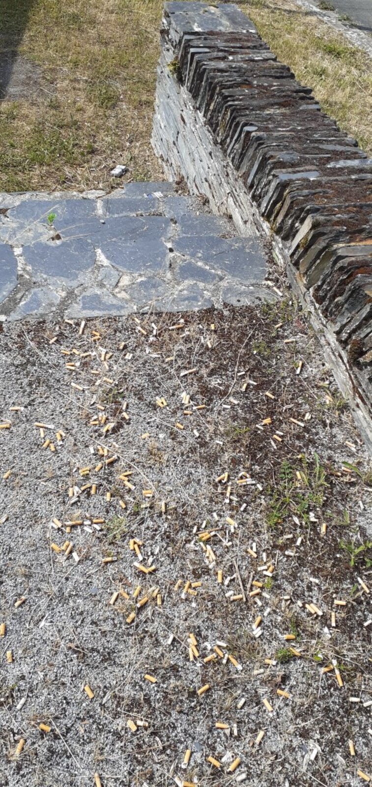 Abandon de mégots en grande quantité au niveau d'un chemin public dans une zone résidentielle