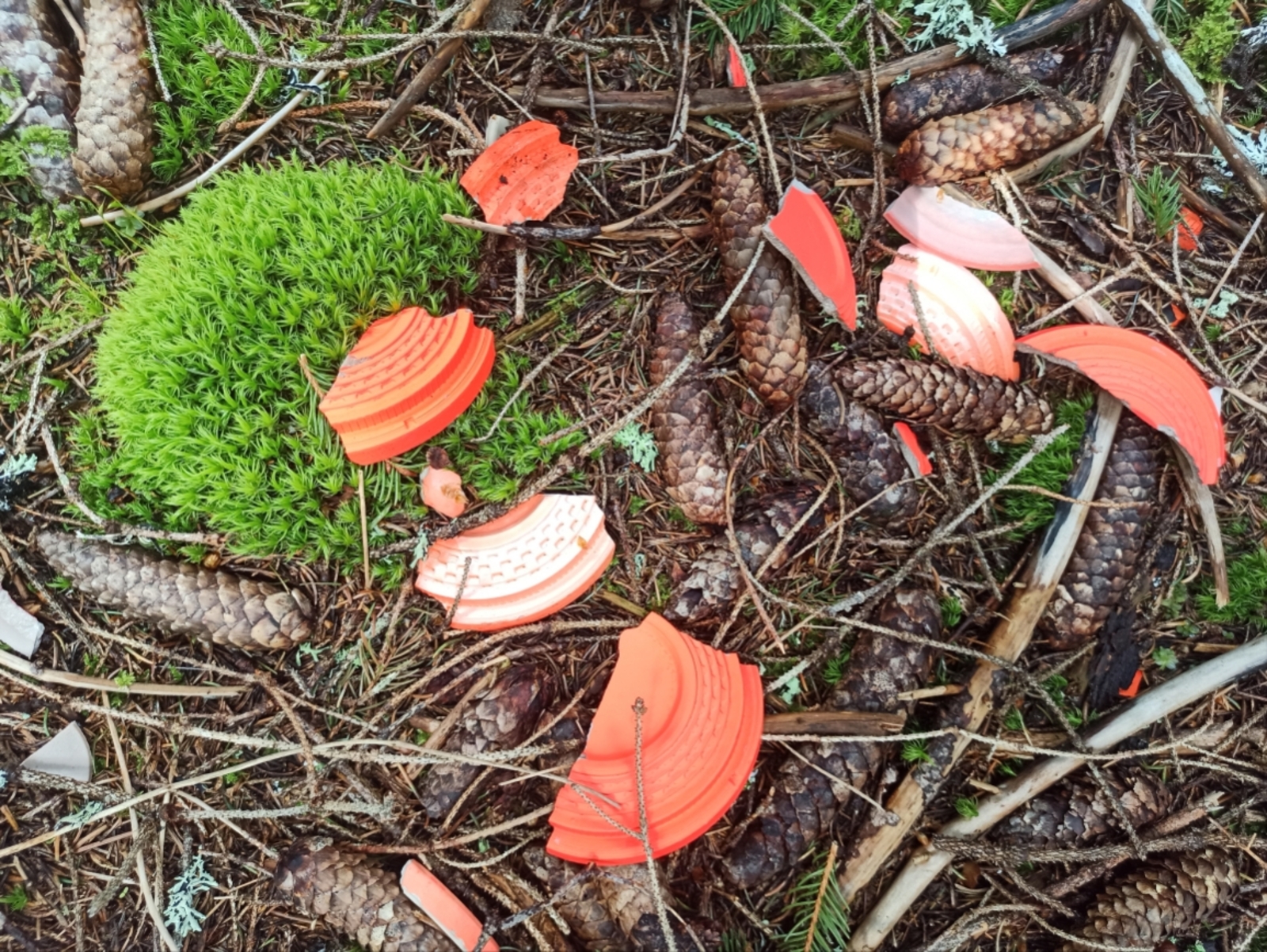 Déchets de ball-trap constitués de plateaux en résine synthétique non biodégradables, bourres des munitions et grenailles en plomb et en acier. Les déchets sont retrouvés dans un torrent en bordure du pas de tir.