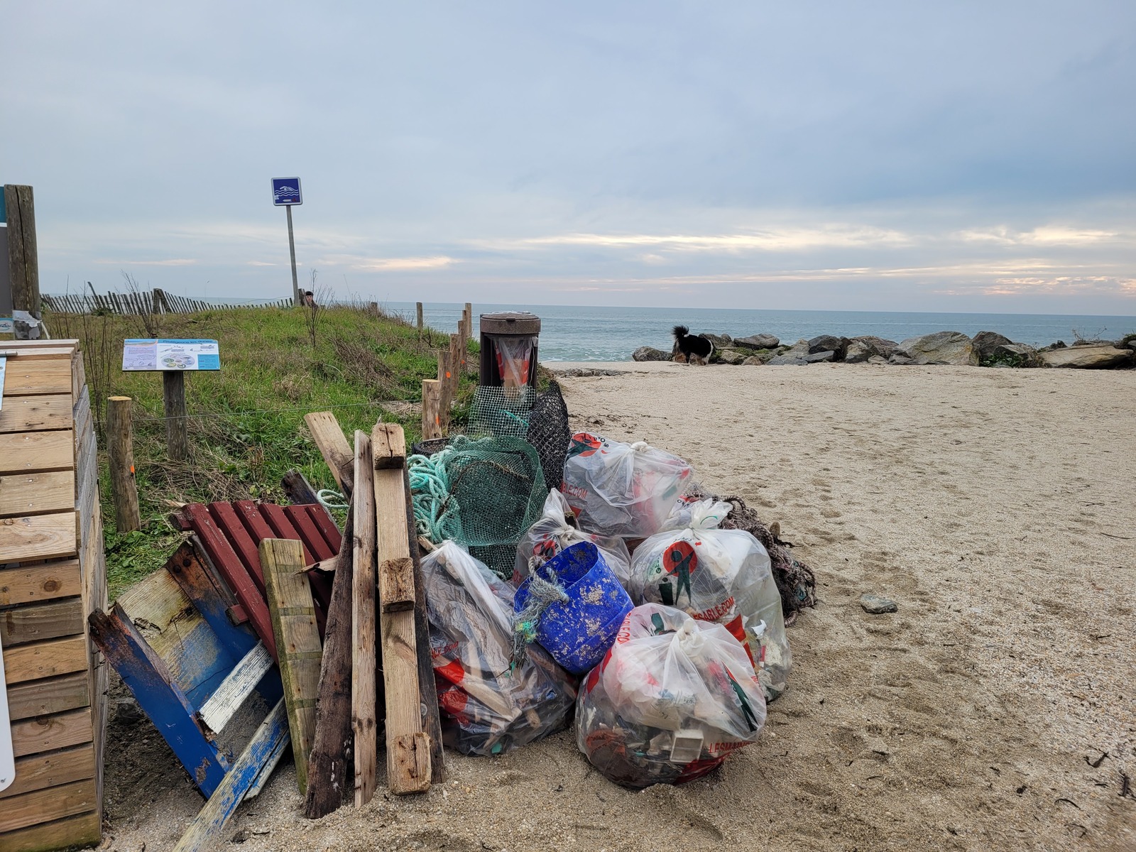 - 88,3 kg de non valorisable (dont 27 bouteilles plastiques) dont 68.6 kg liés aux activités en lien avec la côte (professionnelles, nautiques..) : 3 filets de pêches de plus de 8 kg chacun, 2 casiers. Environ 100 mégots ainsi que 5 biomédias, 4 briquets, 77 bourres de chasse, 6 pailles, 45 cotons tige et bâton de sucette, 1 bombonne butagaz, 1 gilet de sauvetage...