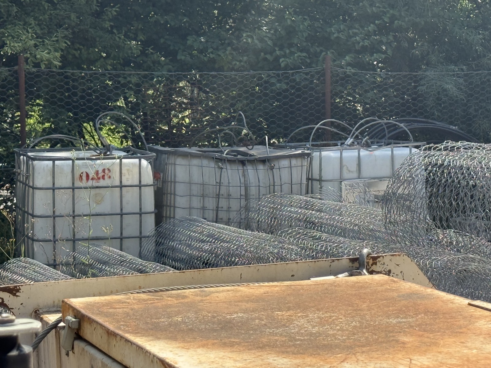 Stockage de produits liquide et de matériel. Zone de stockage fermée, pourtant interdite dans le PLU car zonage Ne.