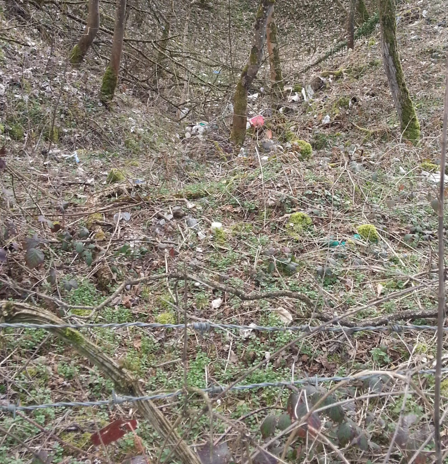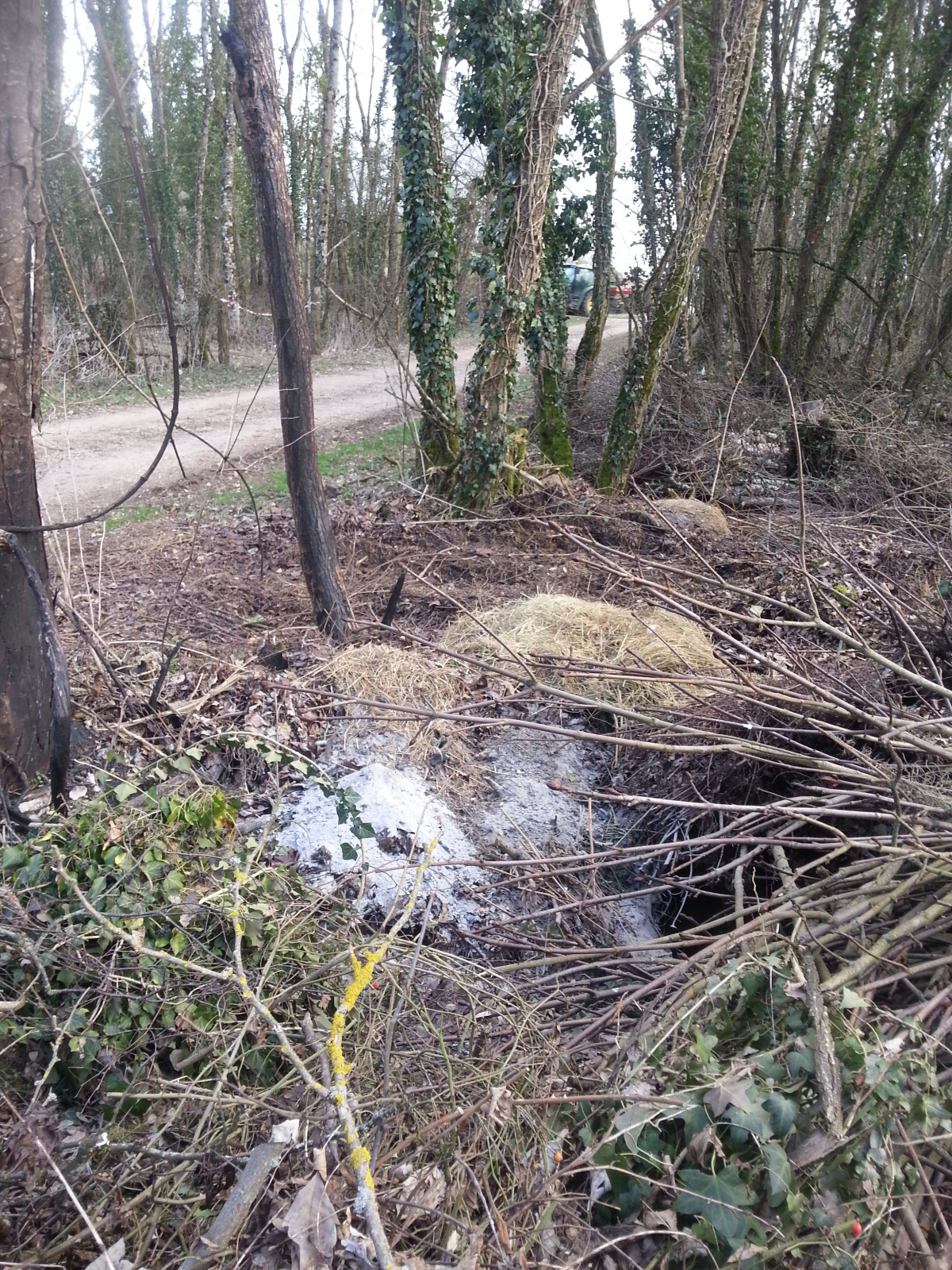 Dans un chemin, se trouvent de nombreuses décharges (anciennes carrières ?), contenant des dépôts de gravats (terre et cailloux, de l'herbe, des élagages de haies, des dépôts divers de ferrailles, cuve en fibre de verre, nombreux contenants en plastiques), et des zones de brûlages le long du chemin.