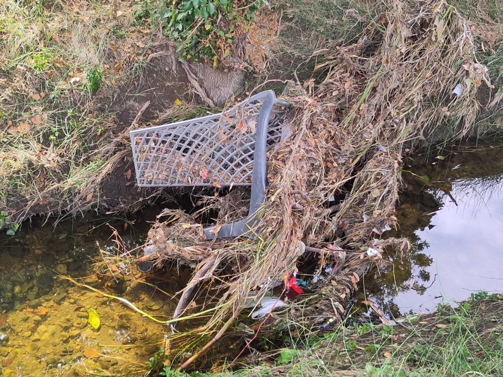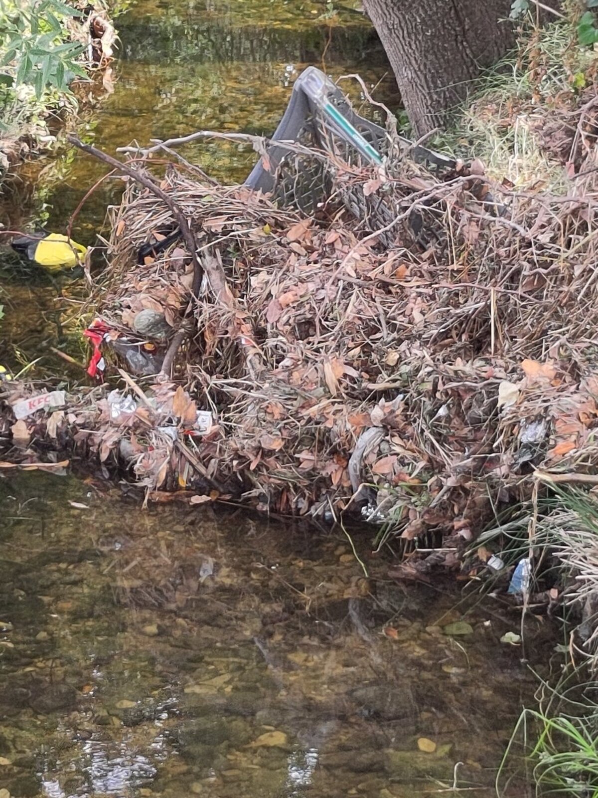 Accumulation de déchets dans un cours d'eau suite aux récents orages : un cadis délaissé ou apporté là par le cours d'eau empêche le bon écoulement des eaux et retient un certain nombre de déchets et de branches ou feuilles mortes qui s'accumulent dans le cours d'eau.