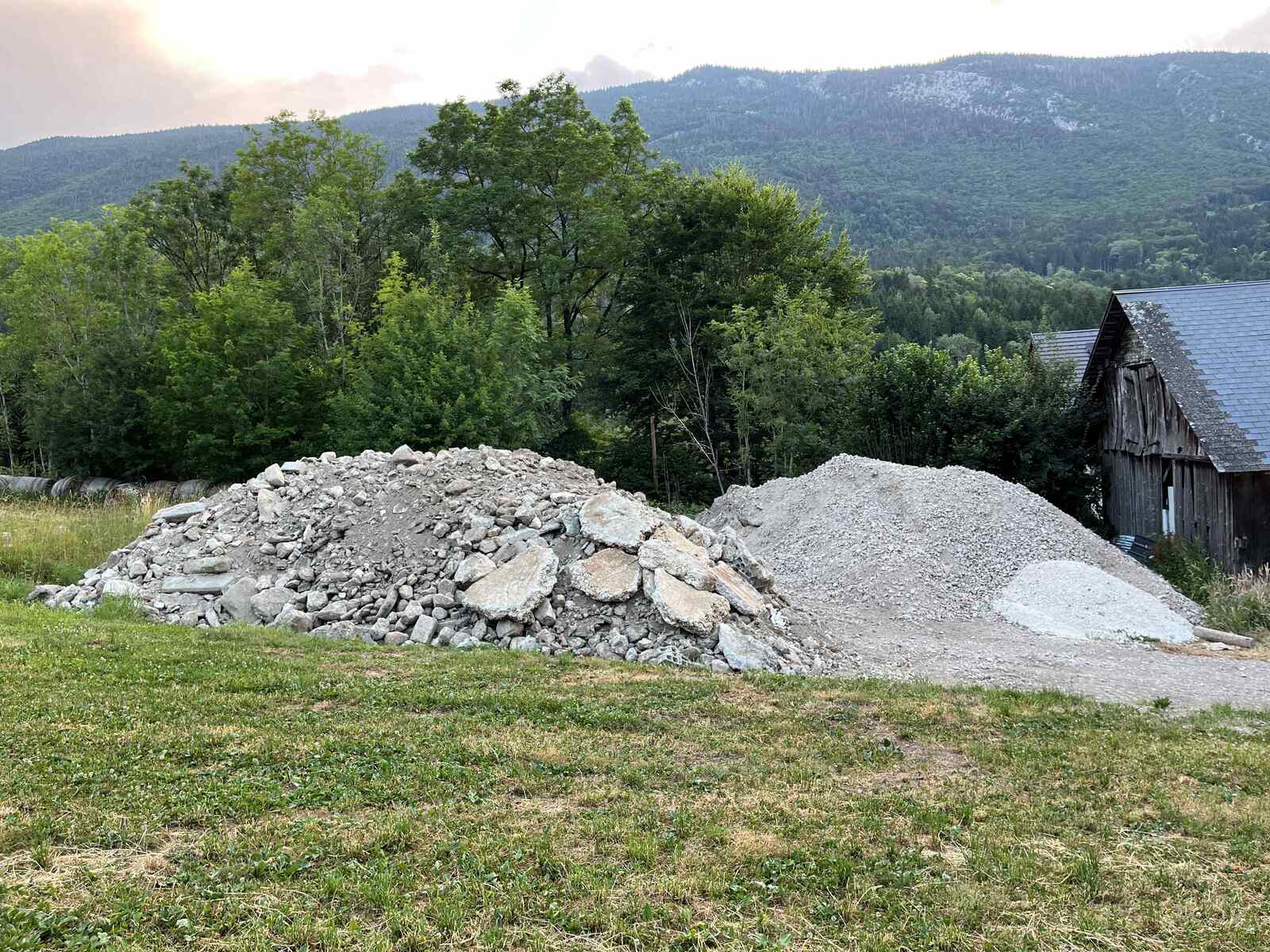 Dans le bas d'un champ dédié au fourrage, une activité récurrente depuis environ 2 ans de dépôt de déchets de déconstruction avec 1 à 2 fois par an l'utilisation d'un concasseur de carrière pour produire des agrégats.