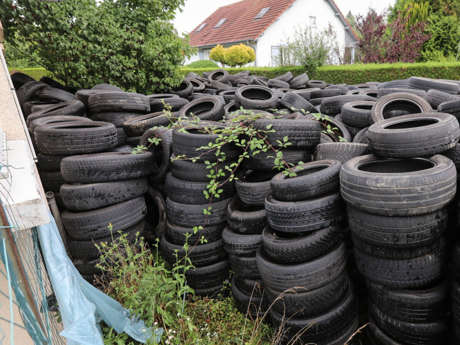 Stockage de plusieurs centaines de pneus usagés sur une propriété privée en zone pavillonnaire, en limite du Centre Hospitalier Spécialisé de Novillars, depuis le printemps 2025.