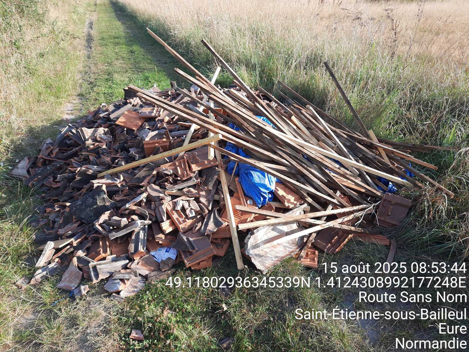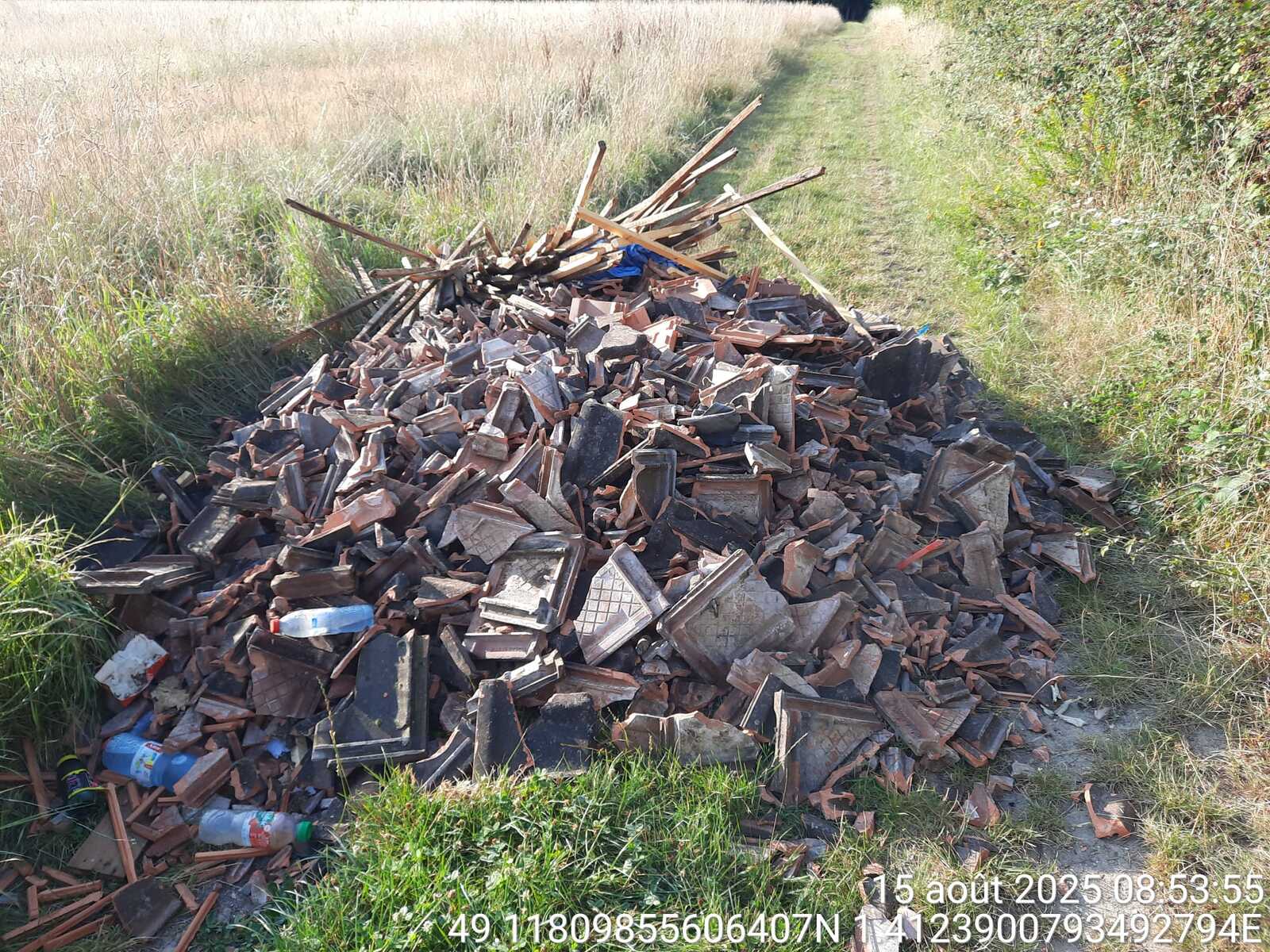 Dépôt de déchets divers (principalement bois et tuiles) au milieu d'un chemin signalé grâce au dispositif CEV'Alerte.