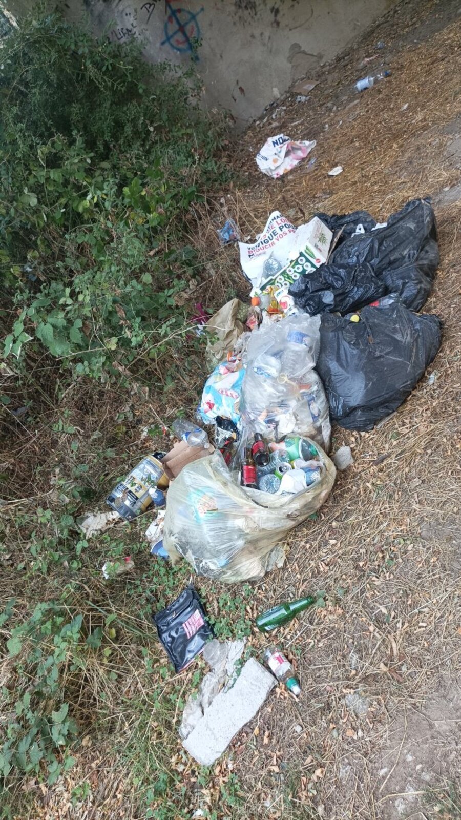 Divers restes de pique-nique abandonnés sous le Pont canal côté Nièvre : emballages repas et boissons, fût de bière ...