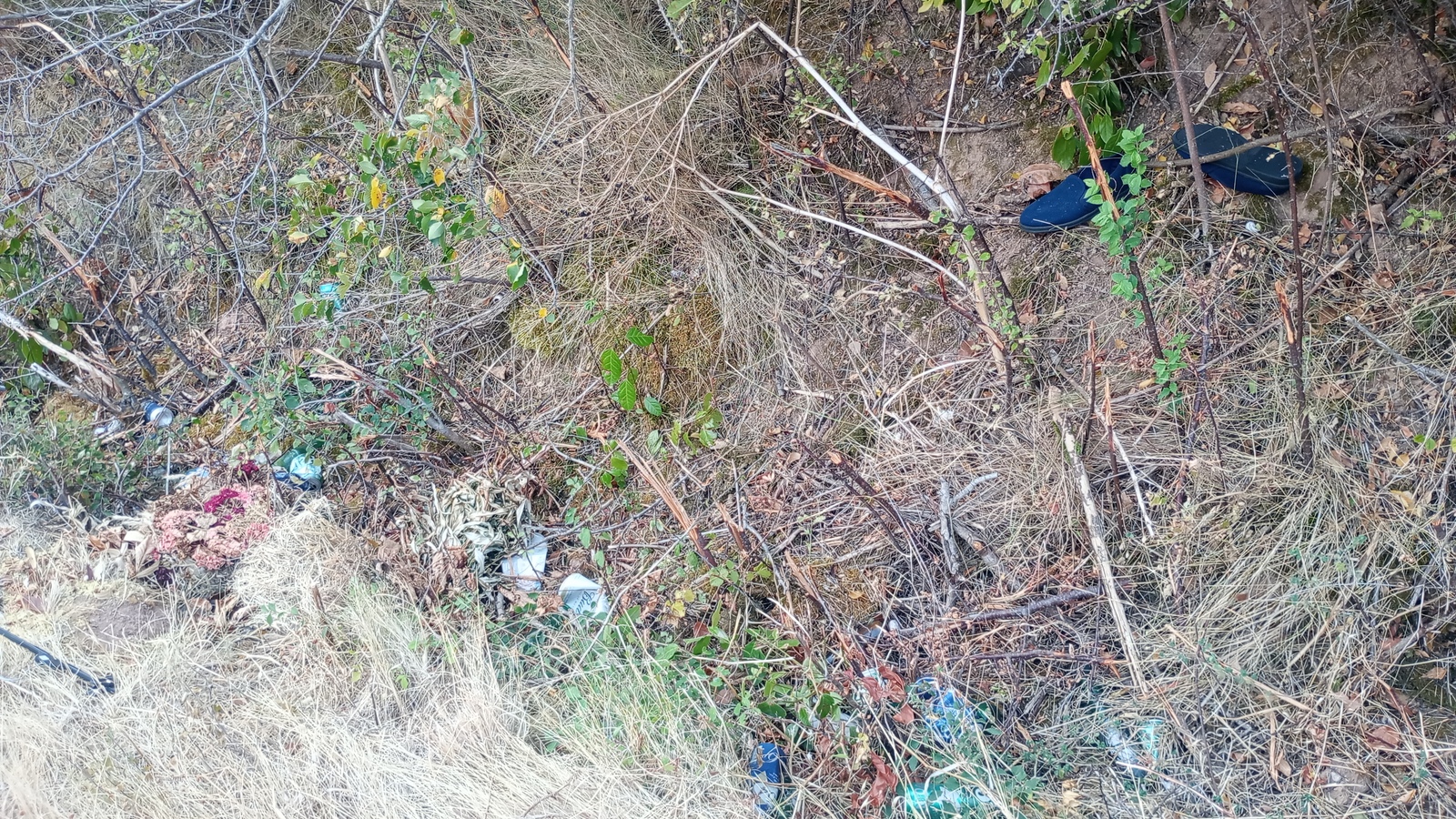 De nombreux déchets jonchent le sol tout le long du fossé.