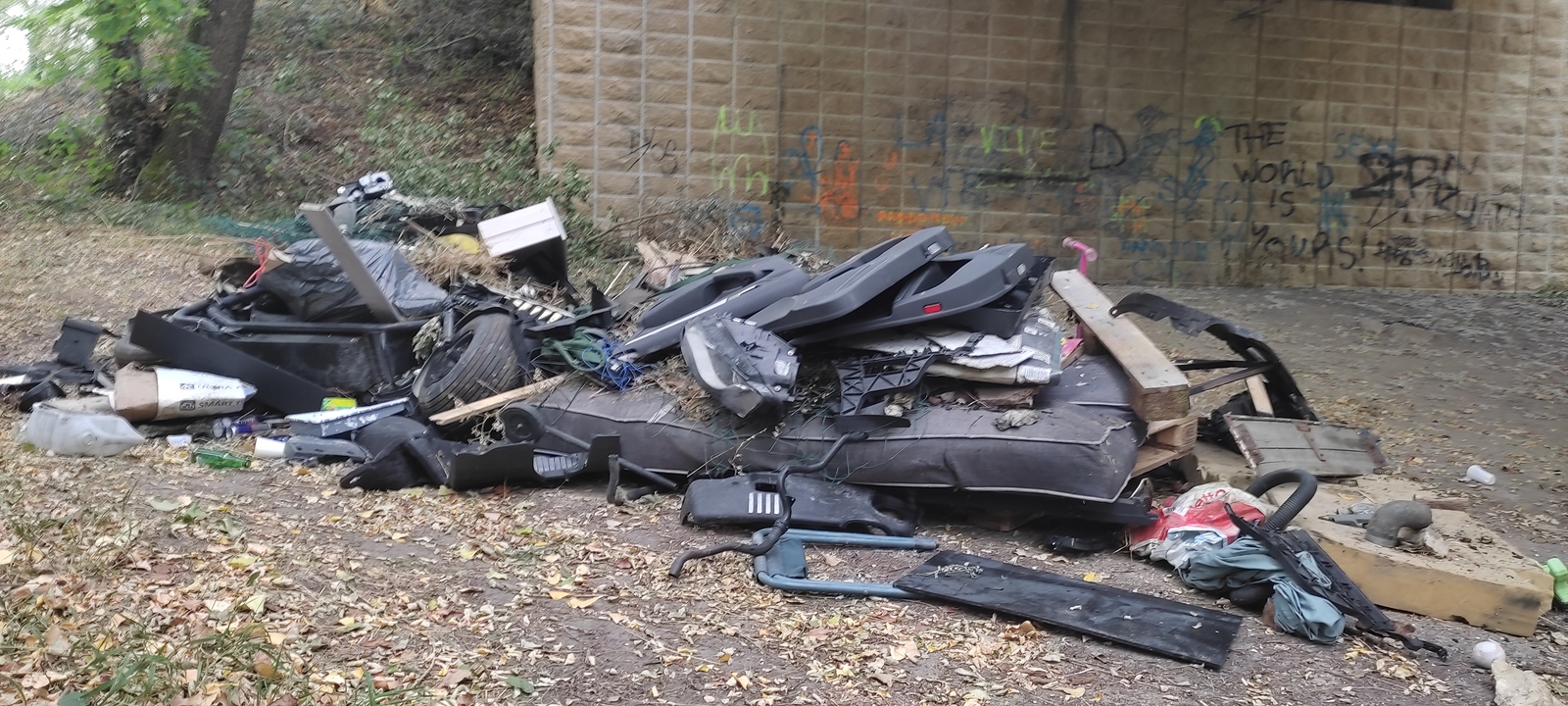 Abandon sous le pont routier enjambant l'Allier : Pièces automobiles, Huile de vidange, Moto, Différents matériaux ...